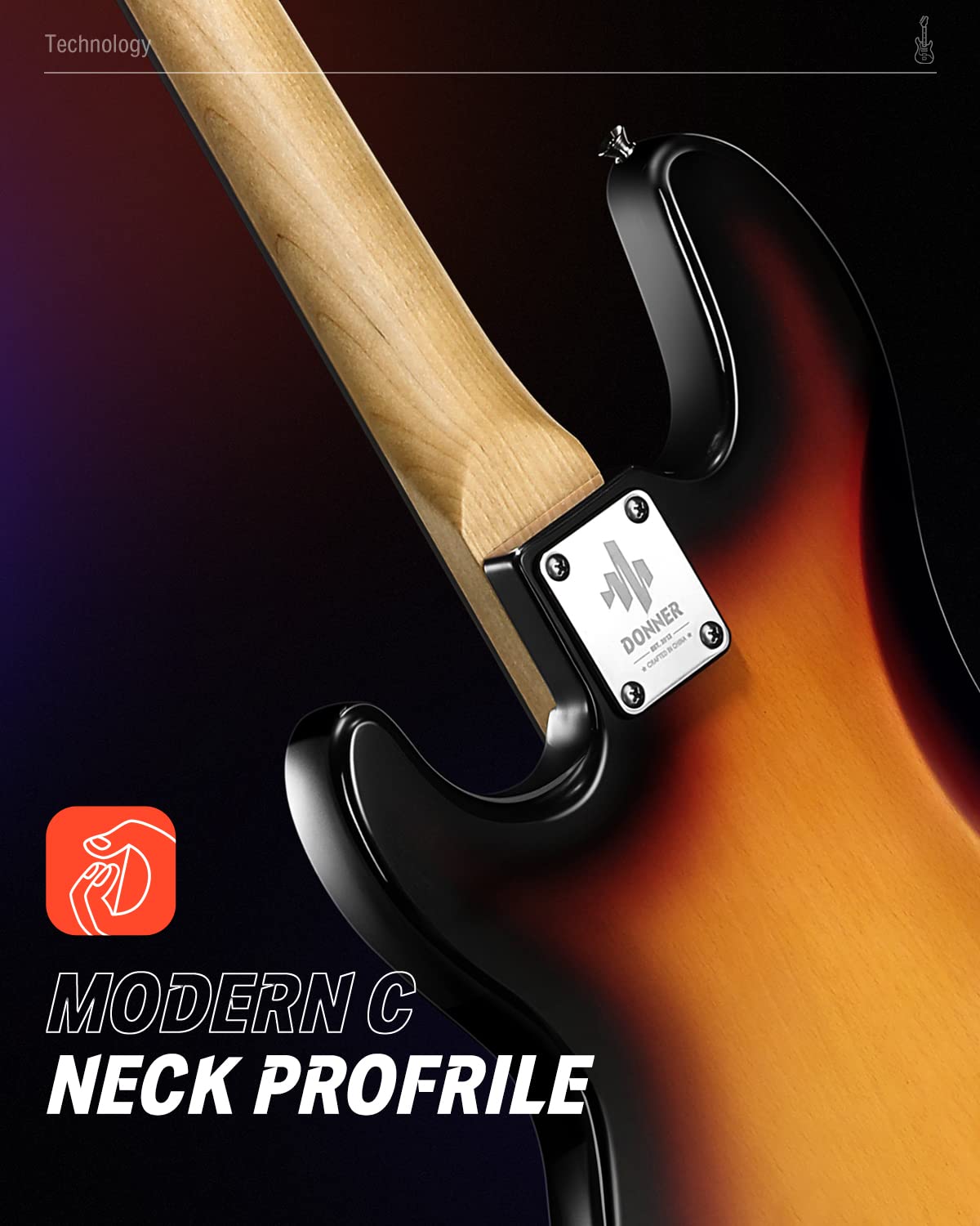 [Smooth & Playable]: Donner electric bass with AAA purpleheart fingerboard, AAA Canadian maple neck with the superior finish on the back of the neck provides a smooth fret-hand feel and combines comfort and performance, quality materials improve comfort for your playing. With a “Modern C”-shaped profile, suitable for various playing styles