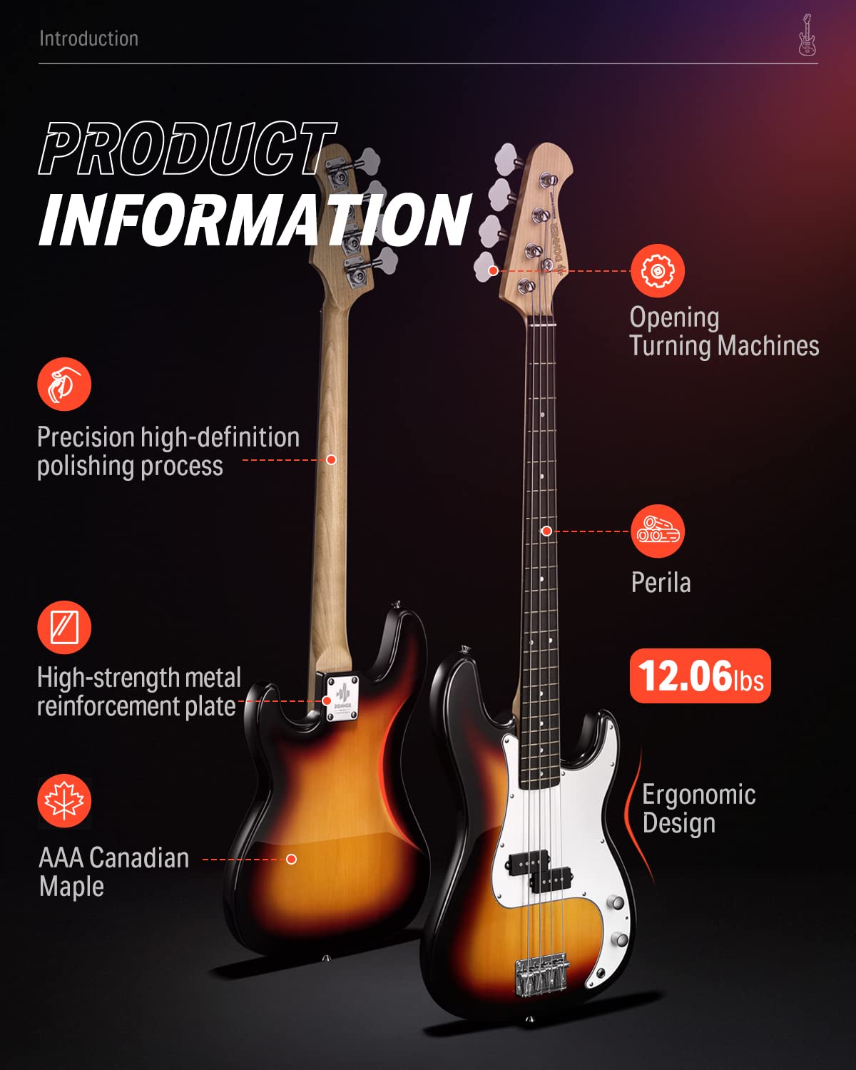 [Classic Bass Pickups]: Donner PB-Style electric bass with classic bass pickups, deliver classic tones with all the warmth and crisp, clear sound, always the first choice for bass players. The bass is lightweight and designed for portable play