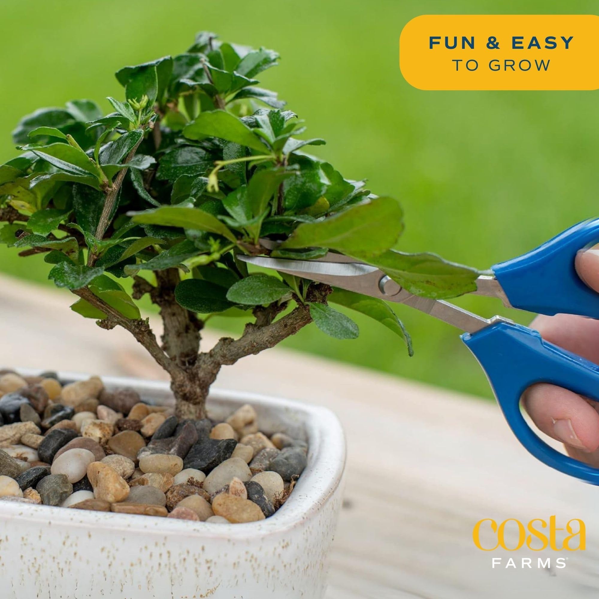 Enjoy the beauty of Bonsai, which features solid, green foliage and is fantastic for small spaces. Grow Bonsai in bright, indirect sunlight. Water it about once a week with approximately 1/2 cup. Ensure excess water drains. Adjust as needed for your environment. Never let Bonsai sit in water or saturated soil. _x000D_ When shipped, it’s about 10-inches tall, measured from the bottom of the pot to the top of the plant. Bonsai ships in a , 4-inch . To help with water drainage, this container does have holes.Bonsai is generally a moderate grower, depending on environment and care provided. Boost growth in spring and summer with a fertilizer labeled for potted plants following the product’s instructions. When Bonsai outgrows its current container, repot by gently removing it from its container and placing it in a 2-inch wider container. Fill with potting mix and water thoroughly. Hardy outdoors in USDA Zones 9-11._x000D_ Exposure to the sap of this plant may cause discomfort to individuals with a sensitivity to it upon contact. Grown for ornamental purposes and not intended for human or animal consumption. Send us your feedback at questions@costafarms.