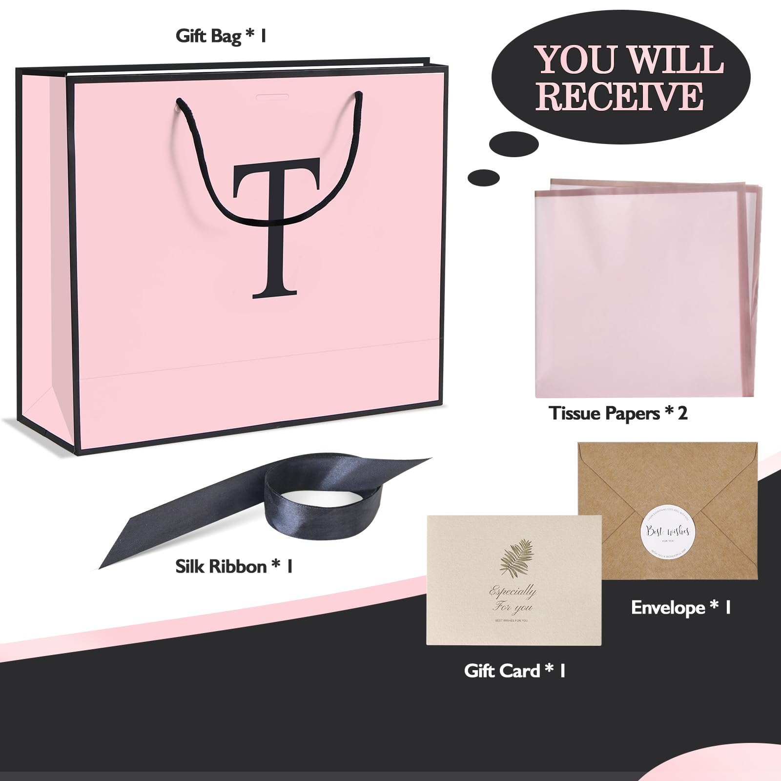 Size and package: Medium:12.6"x4.3"x10.5".Designed by QLSKO, this gift paper bag set is made of 250g of high-quality white cardboard. The set includes a gift paper bag with a handle, a bow ribbon, 2 sheets of high-quality waterproof wrapping paper, an envelope, and a greeting card.