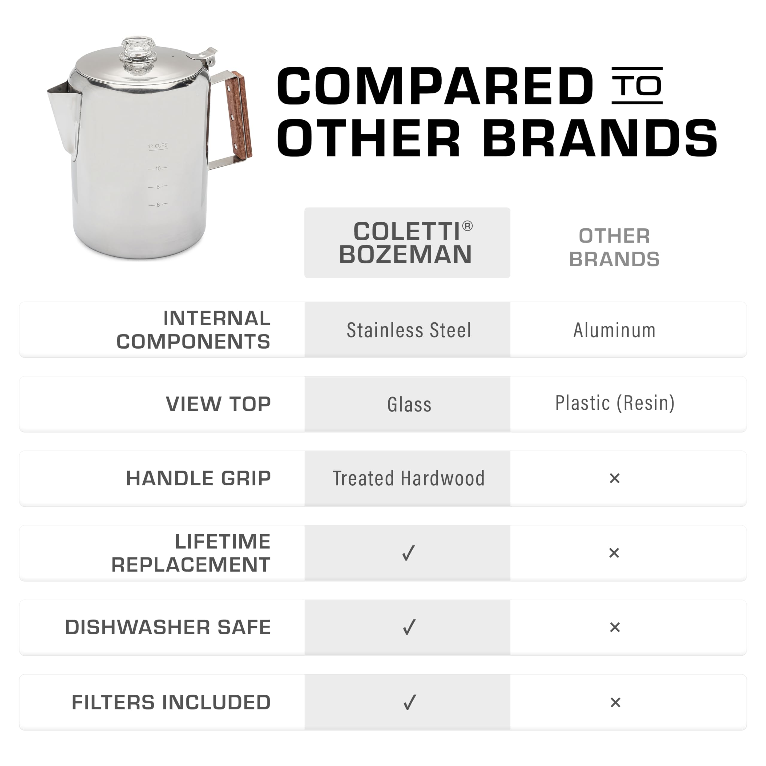 LIFETIME REPLACEMENT GUARANTEE – A camping coffee pot should last a lifetime, and this one will. If it ever fails, we'll replace it. Built for adventure, backed for life. As a veteran-owned company, COLETTI stands behind every coffee percolator we make. Wherever the road takes you, this percolator is ready—Make Great Coffee Anywhere