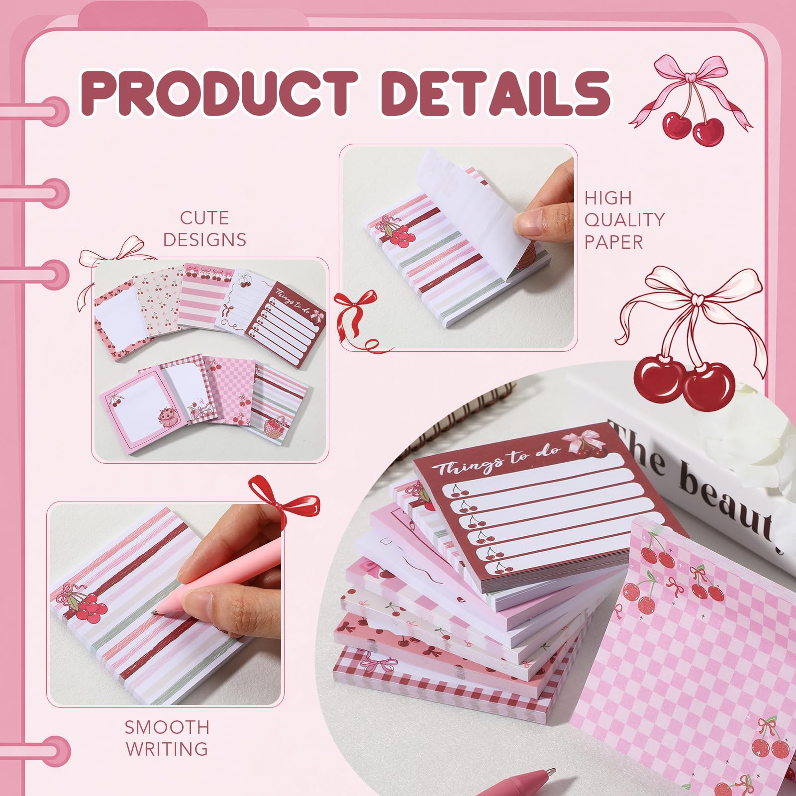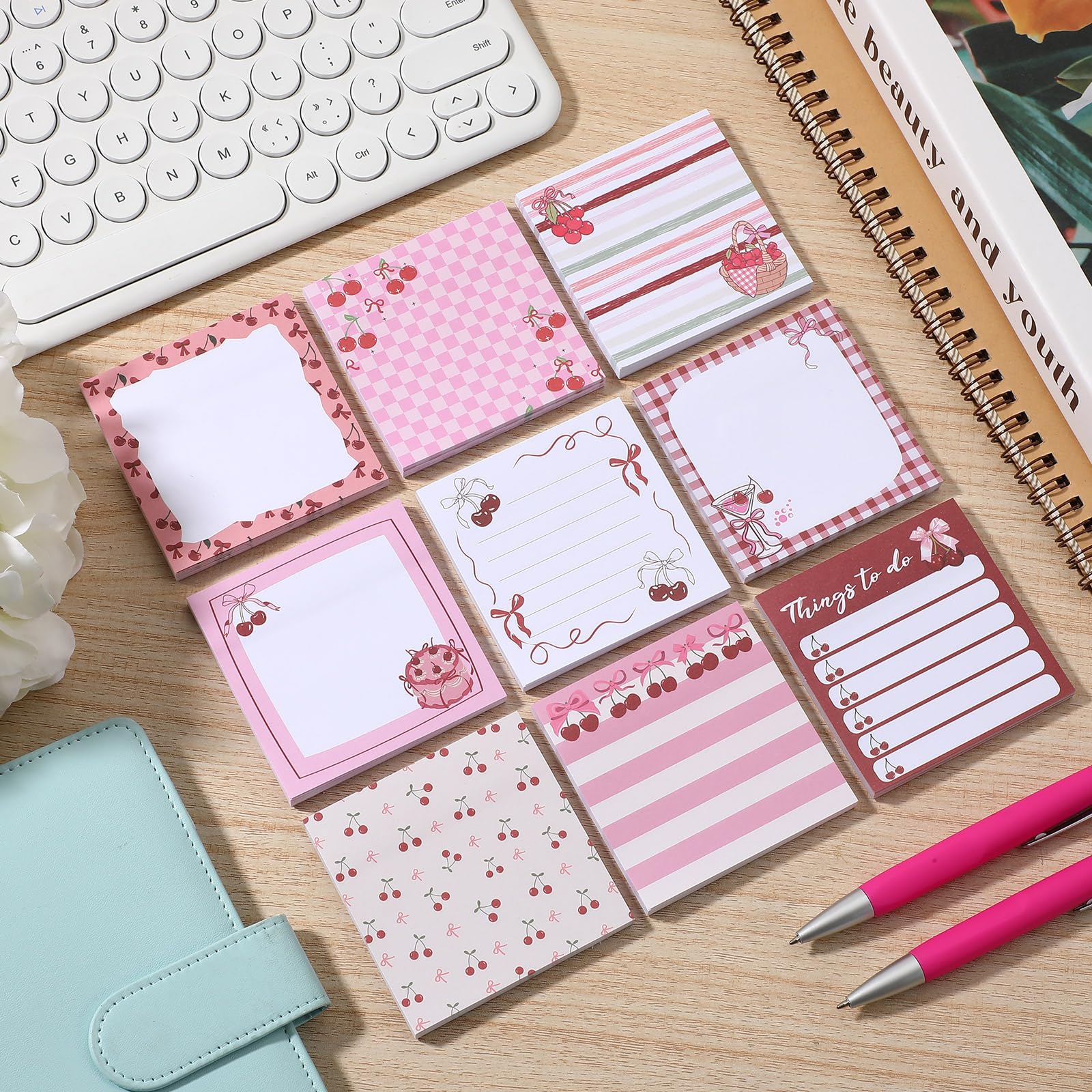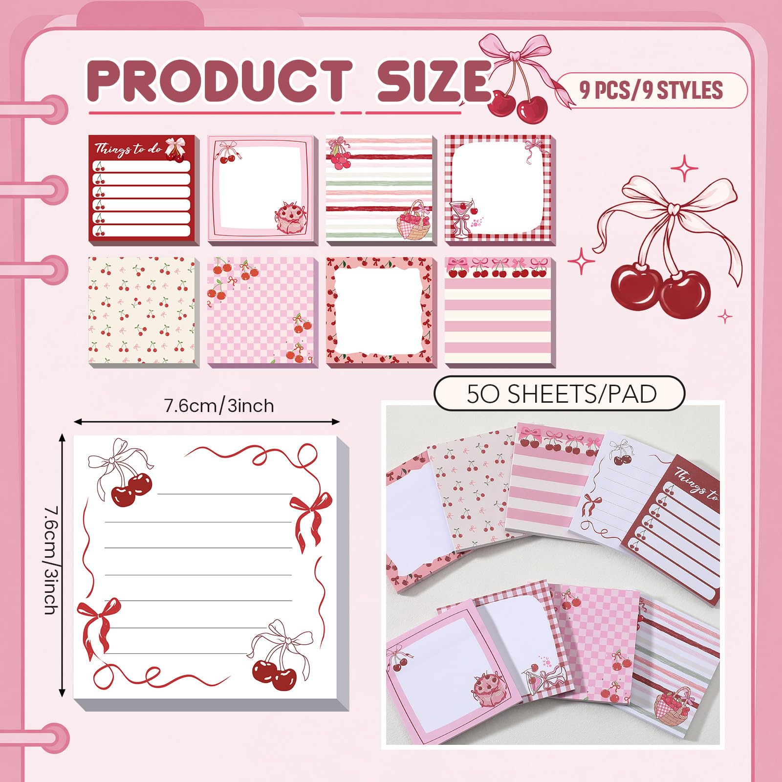 Package Contains: the set of Cherry Bow sticky note pads includes 9 pads, with 50 sheets each, providing a total of 450 useful and attractive notes; Each note measures about 3 x 3 inches/ 7.6 x 7.6 cm, poised to assist in organizing and efficiency tasks