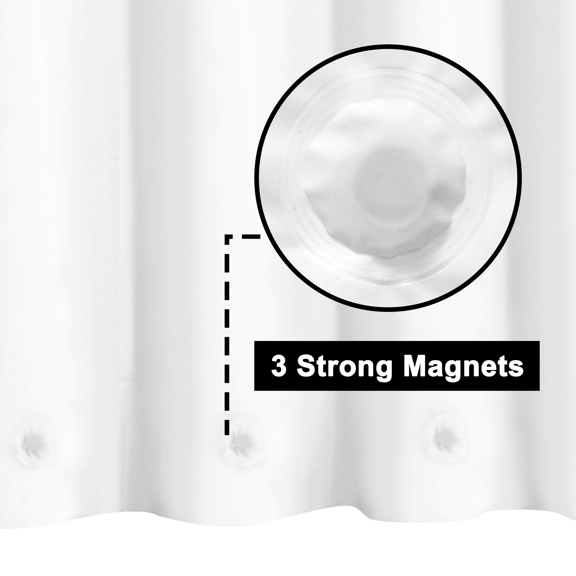 Premium PEVA: Made with 100% PEVA material, the white plastic shower curtain liner is no chemical odor, PVC-free and BPA-free, 3 magnets at bottom & 12 metal grommet holes