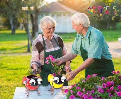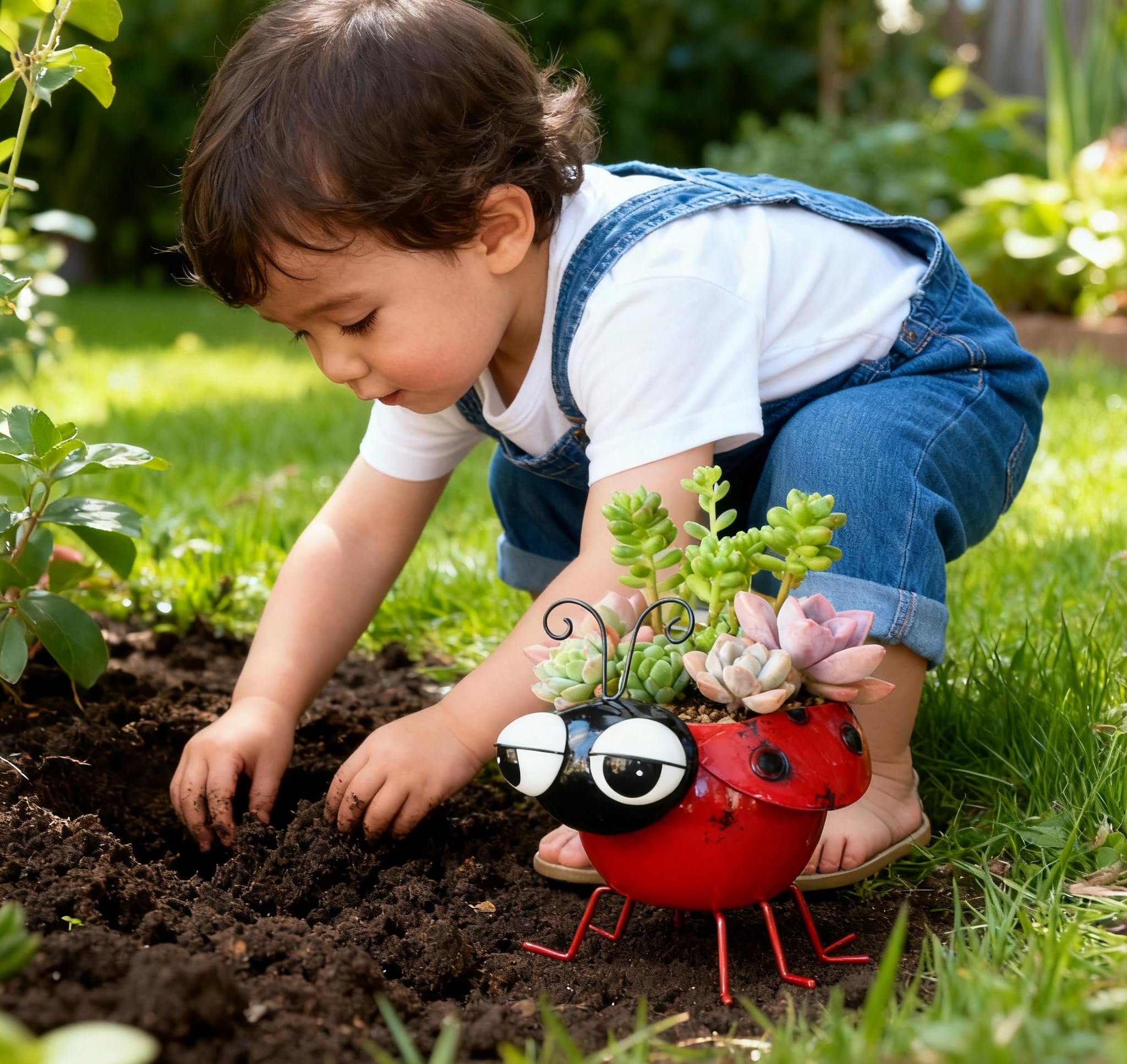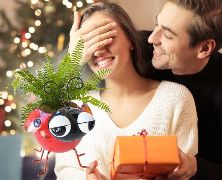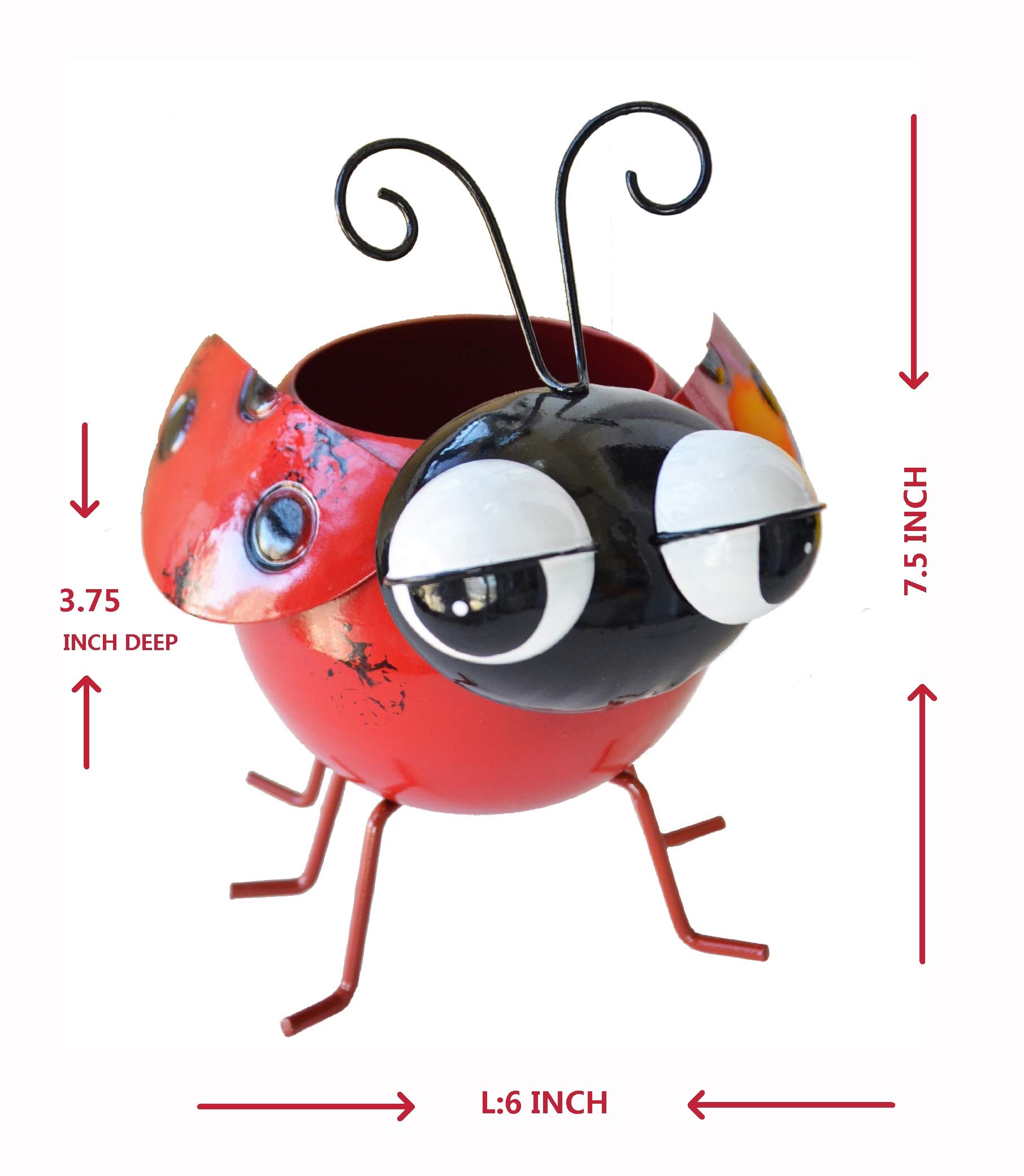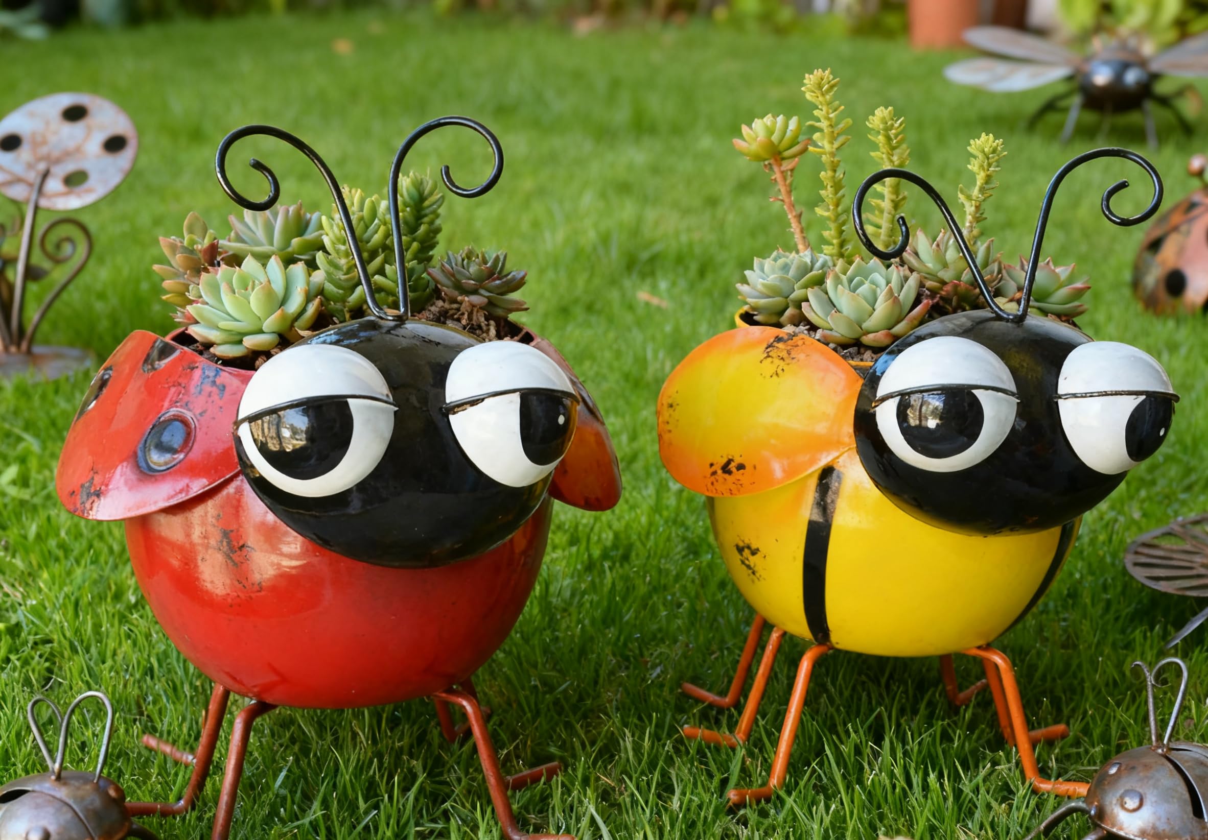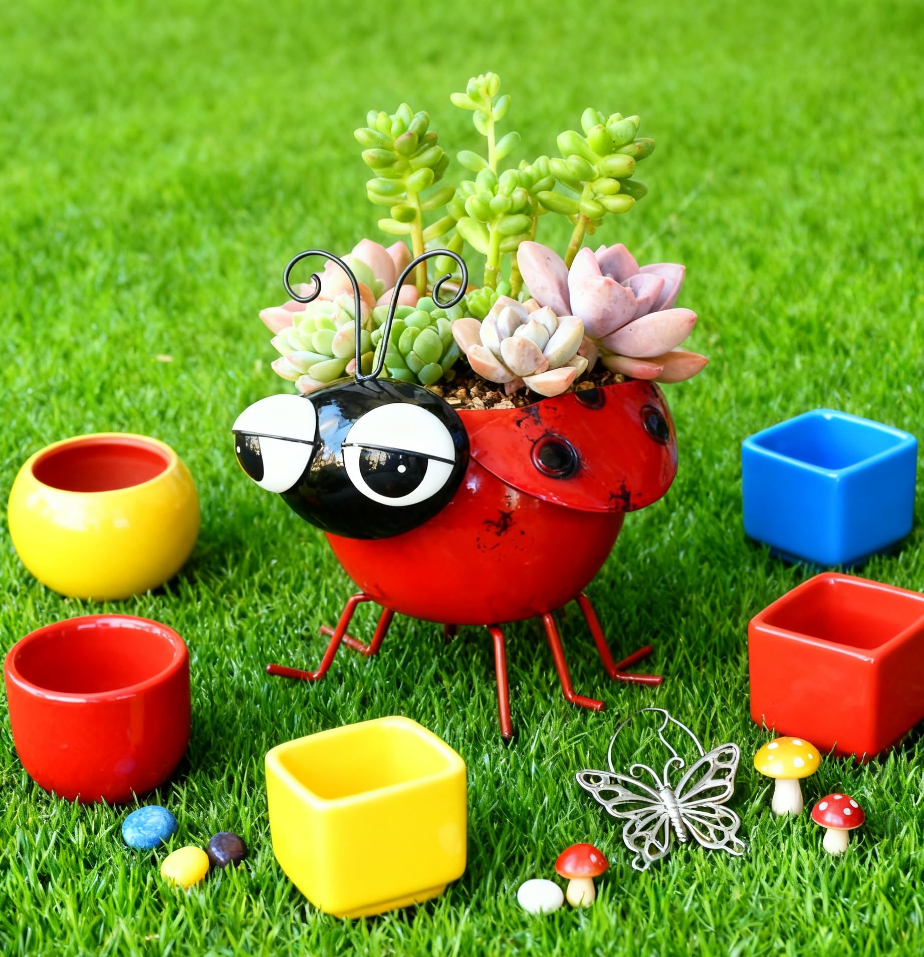 Ladybug wobbly nodding head metal planter pot bright colors make small succulent plants look more vivid