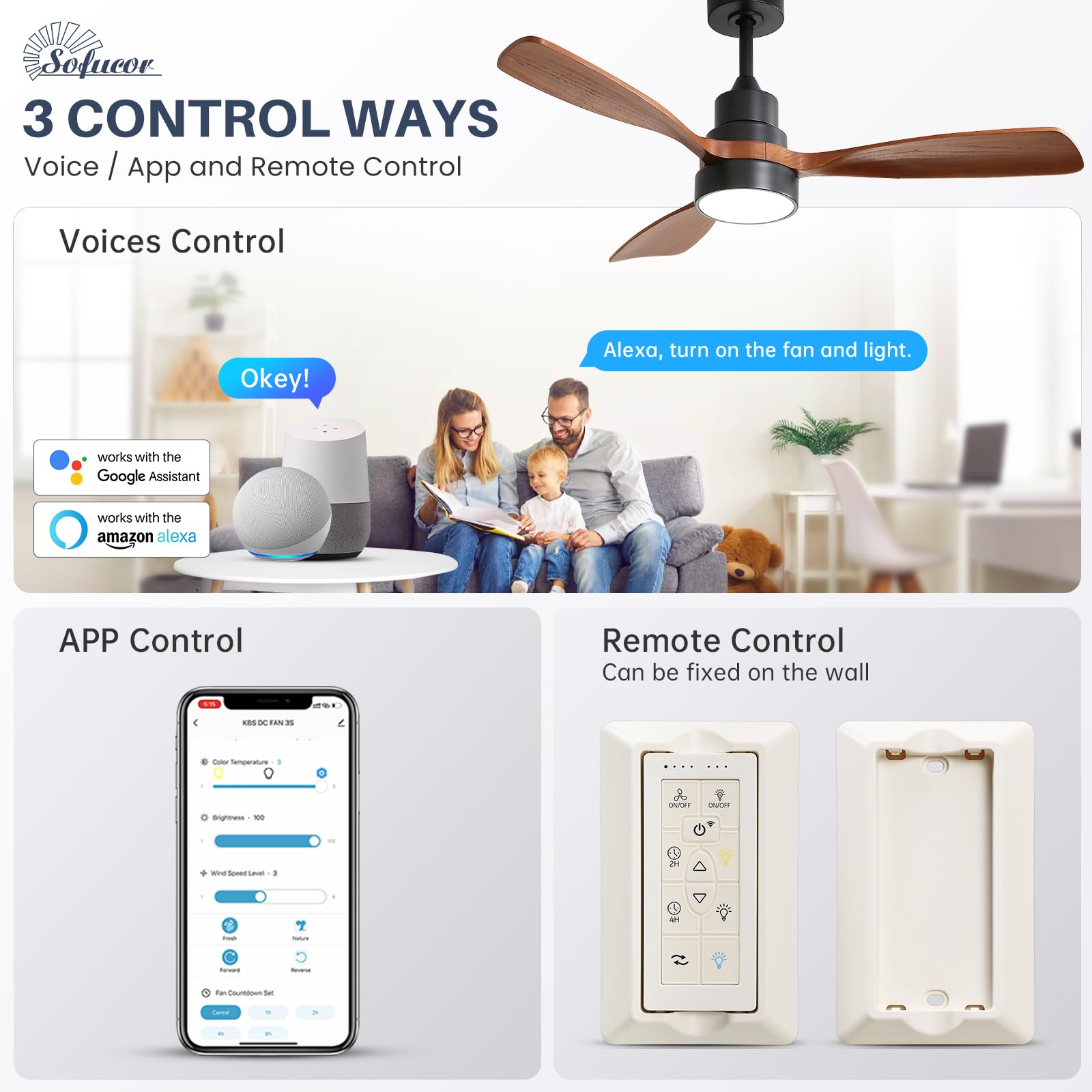 Whisper-Quiet Experience - Sofucor ceiling fans with lights alexa at just 35dB in standard operation (quieter than library ambiance) and a 30dB "deep sleep" mode, vibration-free technology ensures silent airflow, perfect for nurseries, light sleepers, or focused work spaces without disruptive hum.