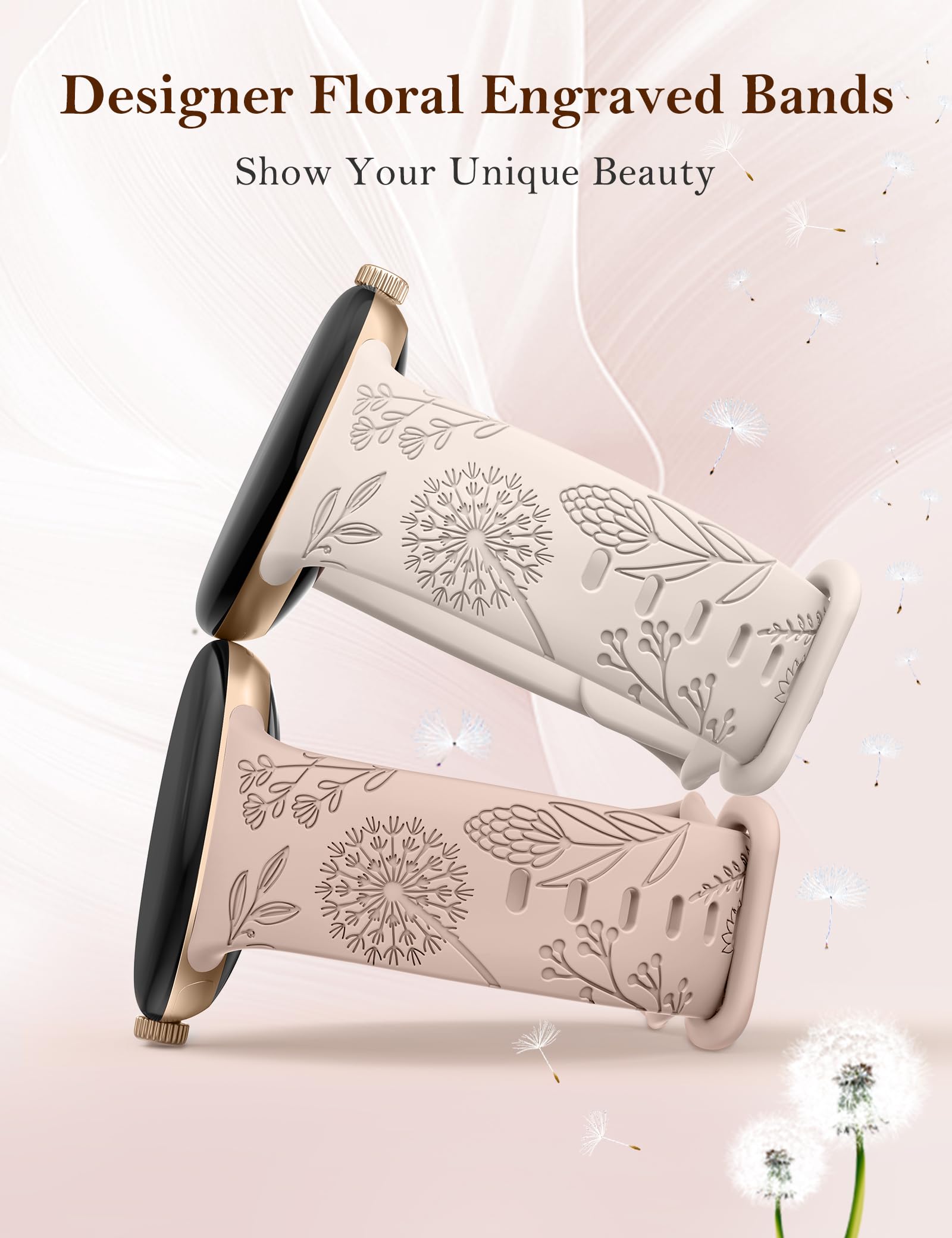 Designer Floral Engraved Google Pixel Watch Bands: Each fancy flower engraved band is made of different wildflower floral and dandelion pattern designs. Wild flowers and dandelions symbolize Fortitude, Growth, Freedom. Let your wishes fly in the vast field of life. like the small flowers of the dandelion, they will fall to the ground to take root and flourish everywhere