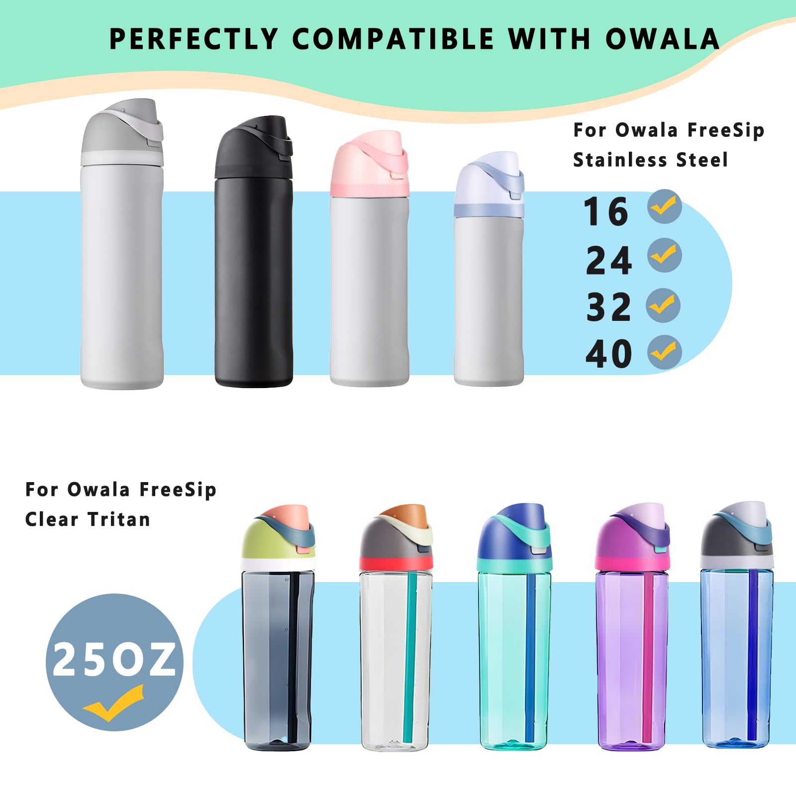 【Perfect Compatibility】This compatible with Owala lid replacement is designed for maximum compatibility, fitting a variety of for Owala Freesip stainless steel bottles (16oz, 24oz, 32oz, 40oz) and 25oz Tritan plastic bottles. It ensures a perfect match with these popular sizes, such as 32 oz, 24 oz, and 43 oz, but we recommend verifying the model before purchase for seamless fitting. Ideal as a replacement for your for Owala cap.