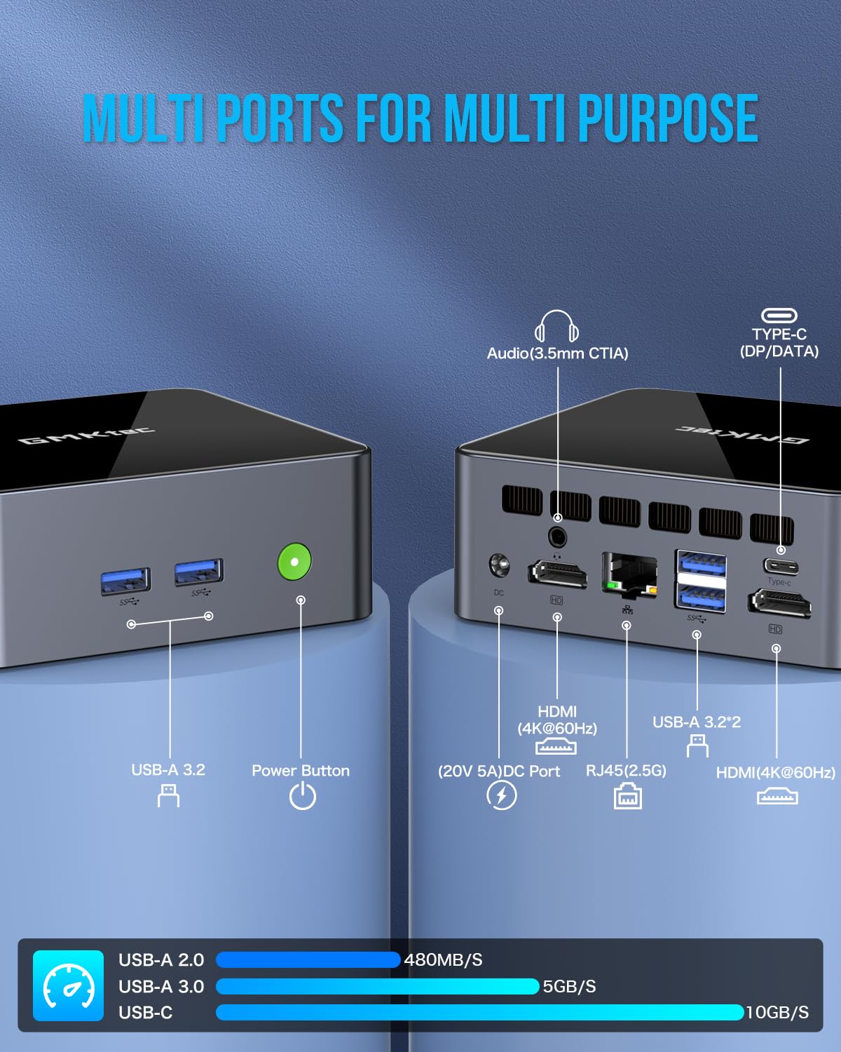 【4K UHD & 3 Screens Support】Mini PC with Intel Iris Xe Graphics G7 96EU GPU delivers high-quality graphics for the most demanding applications, 2 x HDMI (4K @ 60Hz) and 1 x USB Type-C (4K @ 60Hz) output terminals, allowing you to independently display 4K screens on 3 displays at the same time