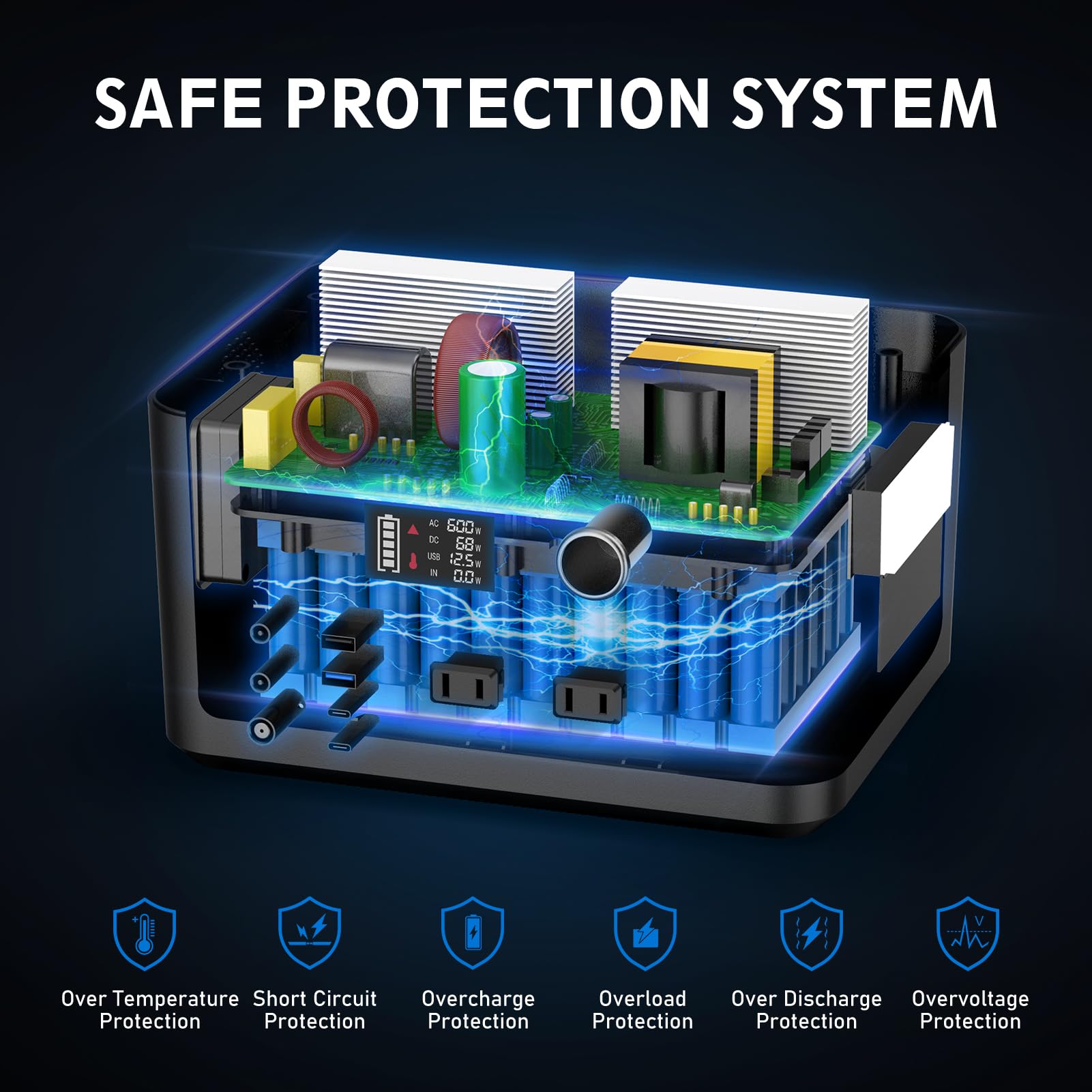 CAMPING BATTERY WITH MOST PORTS: The outdoor backup lithium battery features 2 x AC outlet (110V 600W in total), 2 x USB-A port, 2 x USB-C port, 2 x 10W Wireless Charger, 2 x 12V DC port and 2 x charging port (USB-C, DC). Our portable power generator with wireless charger, you can easily charge 2 mobile phone without cable at the same time
