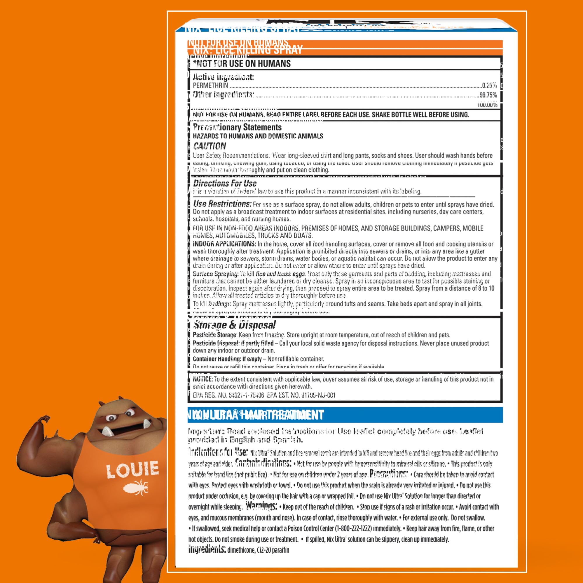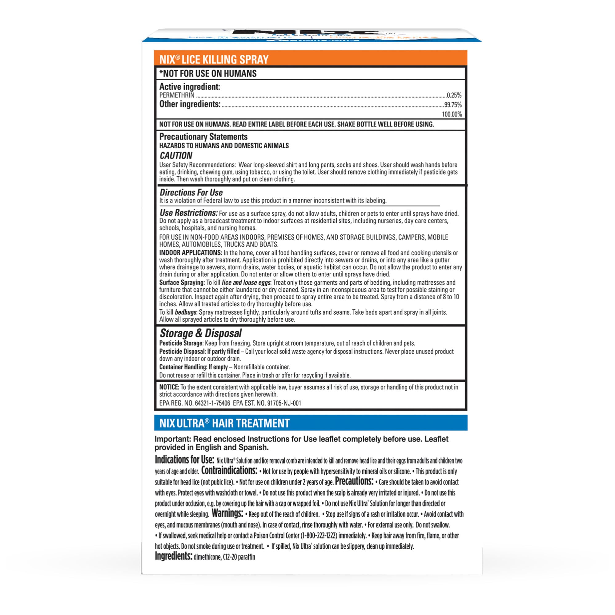 From the number one pediatrician-recommended lice removal brand.* Nix Ultra Lice Removal Kit includes lice treatment products for your hair and home. Nix Ultra Hair Solution is pesticide-free and non-toxic. It works by killing lice and superlice through suffocation rather than using harsh chemicals. First, apply Nix Ultra Hair Solution to hair. Next, wash out with regular shampoo. Then, remove lice and eggs (nits) from head hair with the included Nix Ultra Lice Removal Comb. Nix Home Defense Lice Killing Spray for bedding and furniture will kill lice and bedbugs in your home and is effective for up to 4 weeks and easy to use. Nix lice treatment is trusted by parents and feared by lice. Nix offers a variety of lice combs, shampoos, treatment kits, hair prevention spray and lice spray for furniture and bedding to nix out lice in your home. This multi-product kit from Nix offers great value for your lice treatment needs. *Based on Pediatrician Survey December 31, 2024. Nix Ultra Lice Removal Kit, Lice Treatment Hair Solution, 3.4 fl oz & Lice Removal Comb, Home Defense Lice and Bedbug Killing Spray, 5 fl oz.