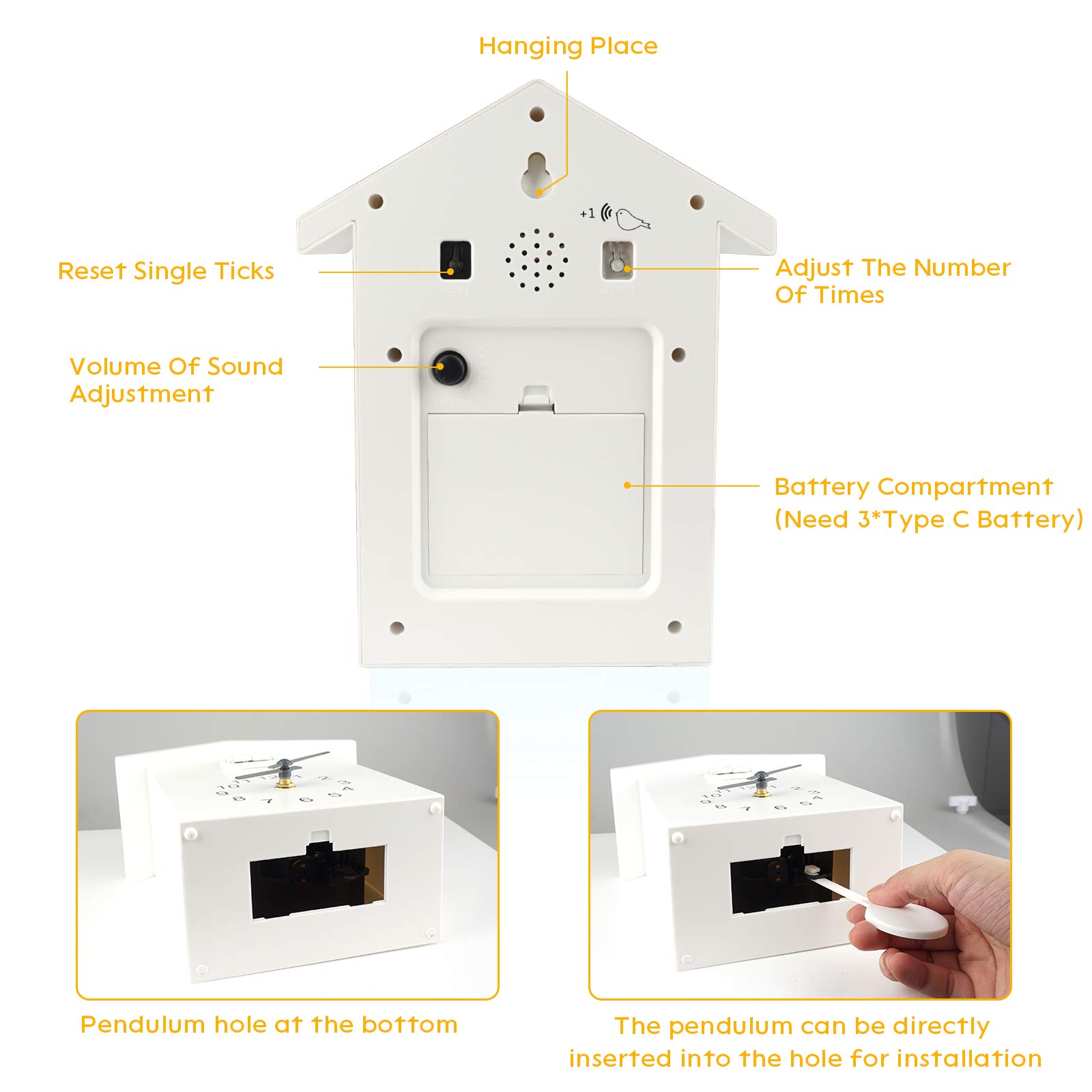 ◆EASY TO SET UP: put it on a shelf or mantle,The cuckoo clock is powered by battery (not included). We recommend using a carbon-zinc battery and replacing it twice a year for optimal performance.Open the lid on the bottom,place one AA battery inside,then pendulum will work.