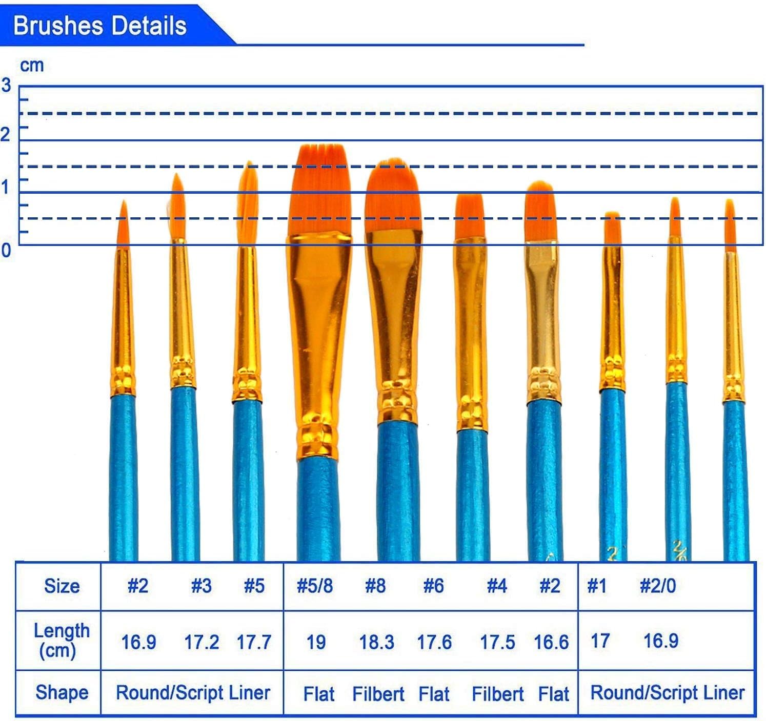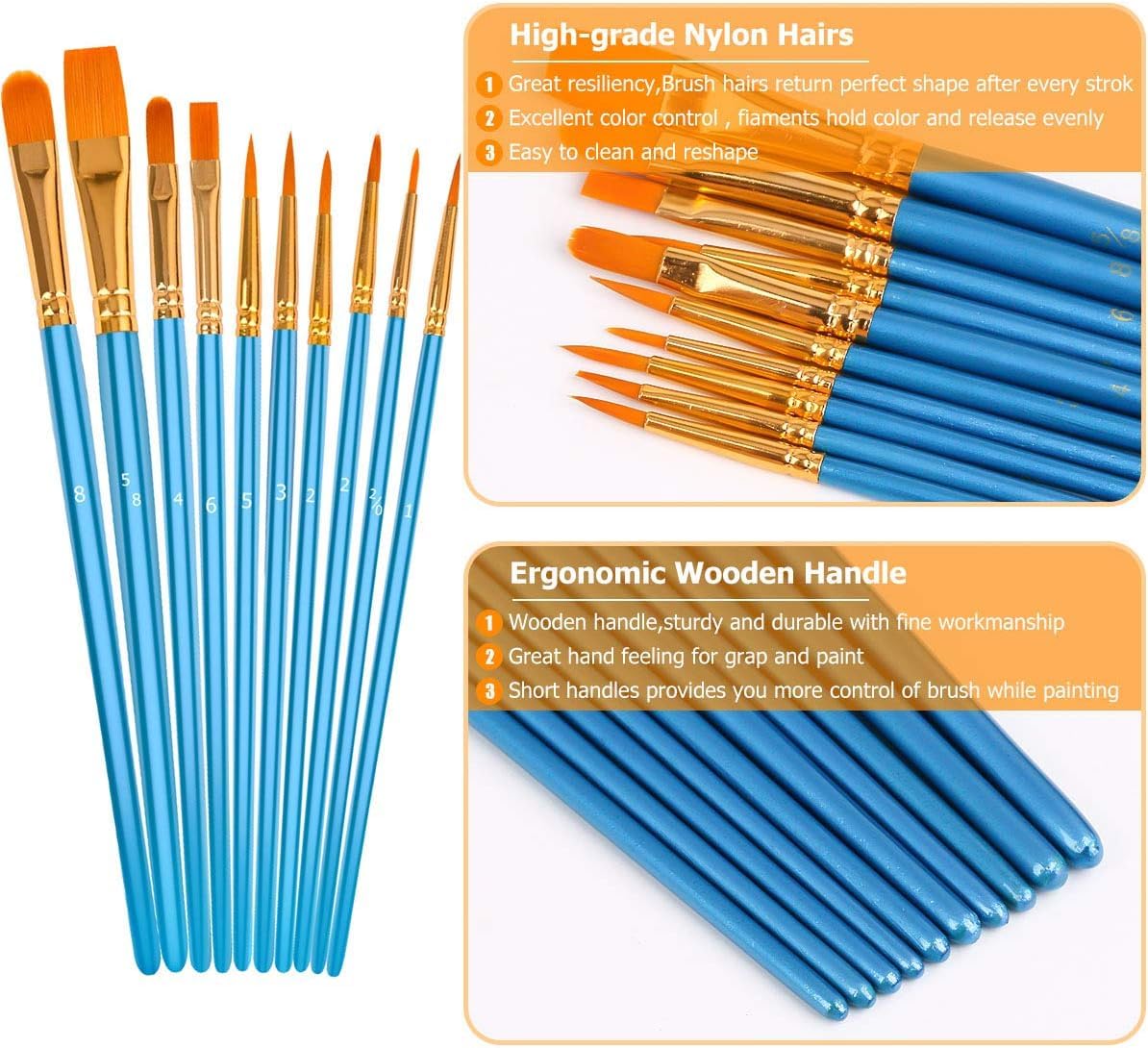 Soucolor Acrylic Paint Brushes Set, 10-Pack Round Pointed Tip Artist Paintbrushes for Acrylic Painting Oil Watercolor Canvas Boards Rock Body Face Nail Art,Blue