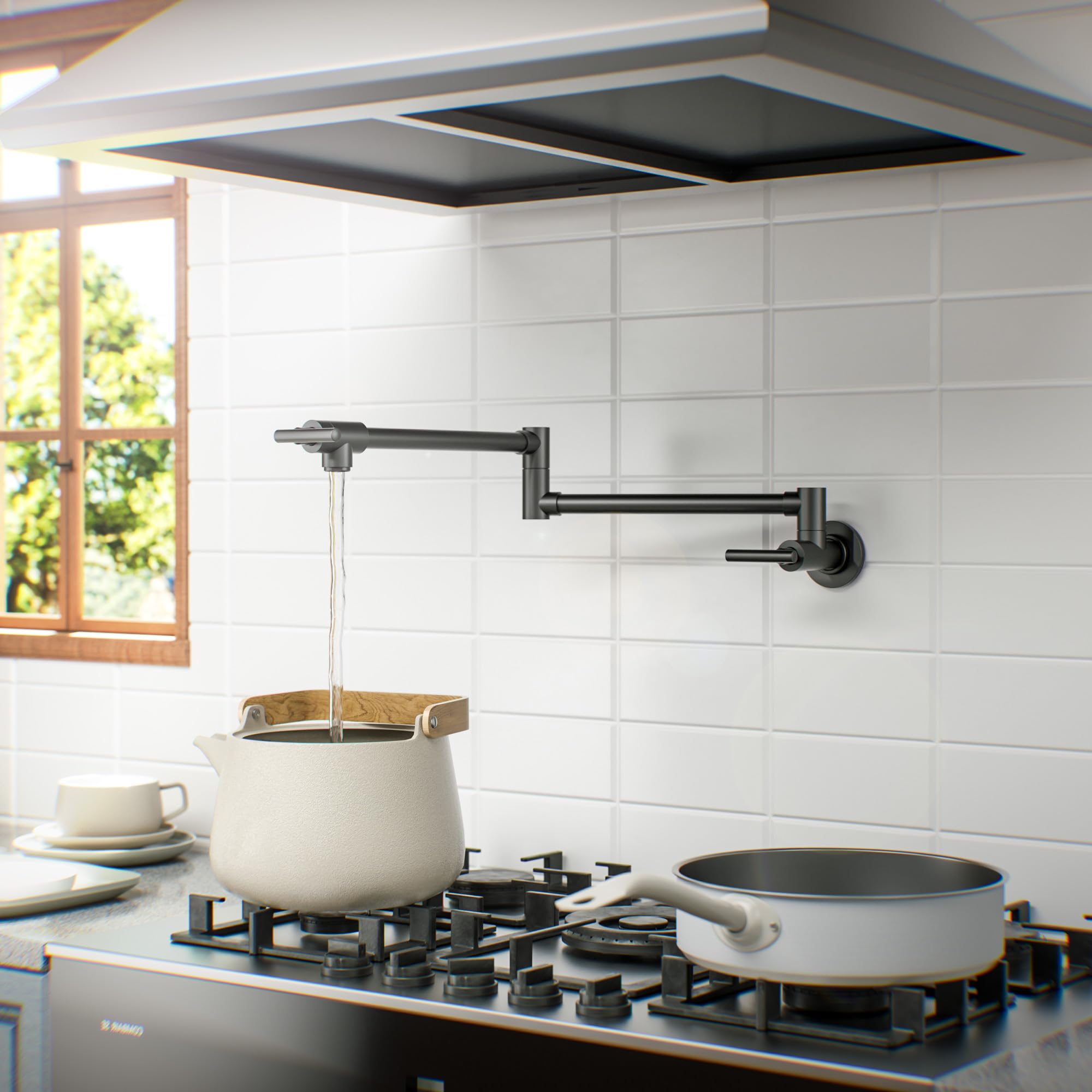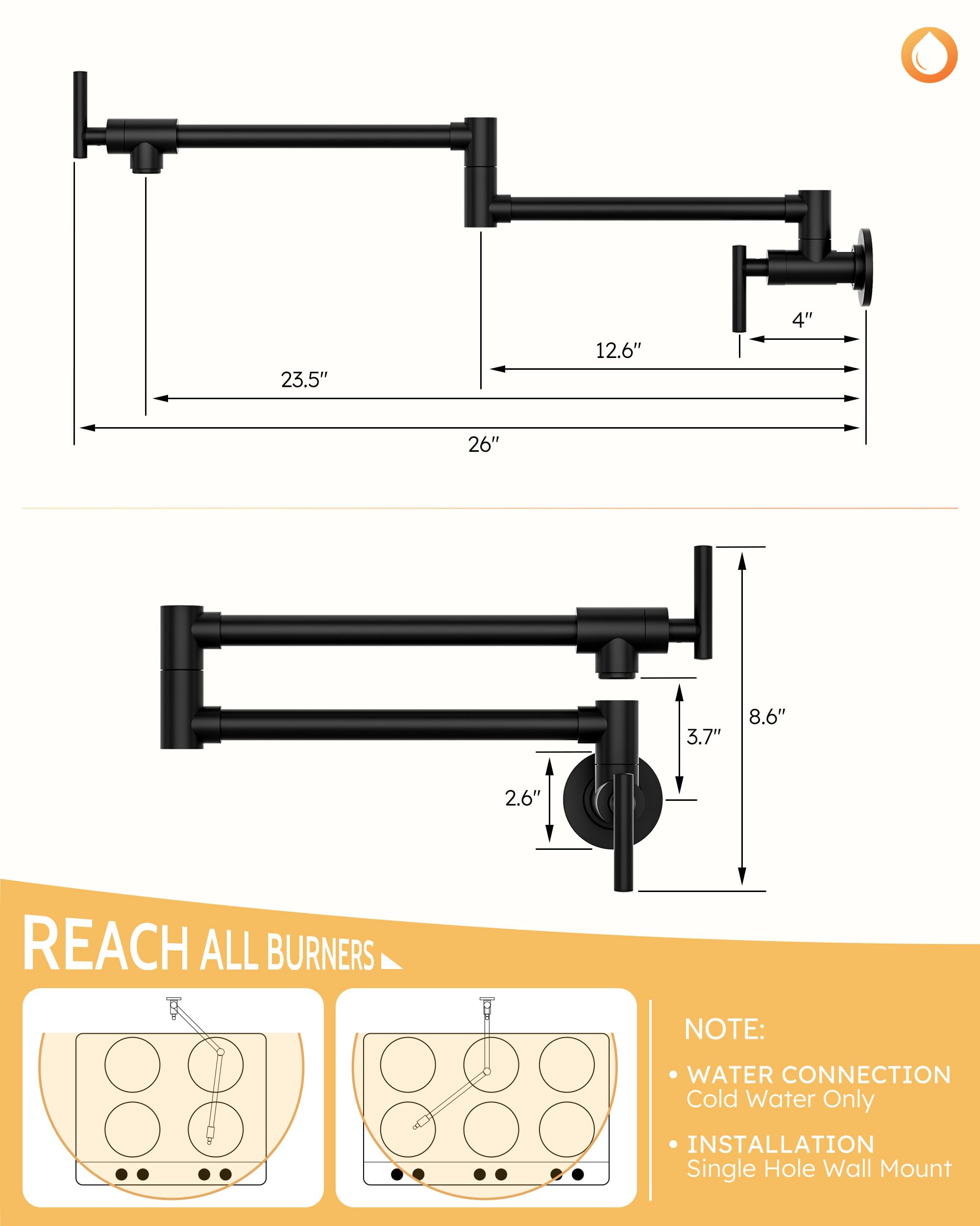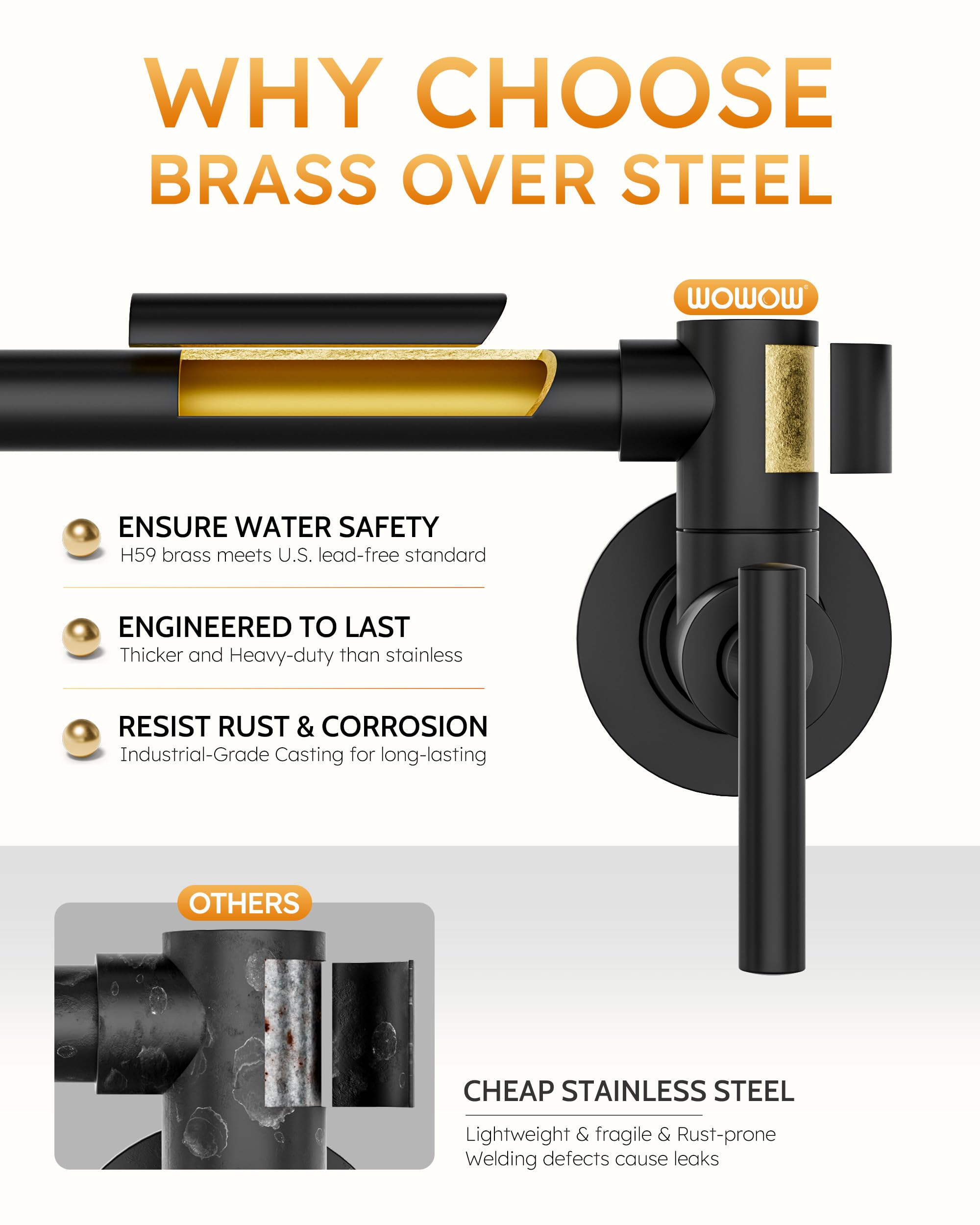 Premium Quality Pot Filler: Made of Solid Brass material, it prevents corrosion and fingerprints, increasing the durability and reliability of the structure. Low-key in a pure black finish, resists corrosion and not easy to oxidize, for creating a classic kitchen decorating style