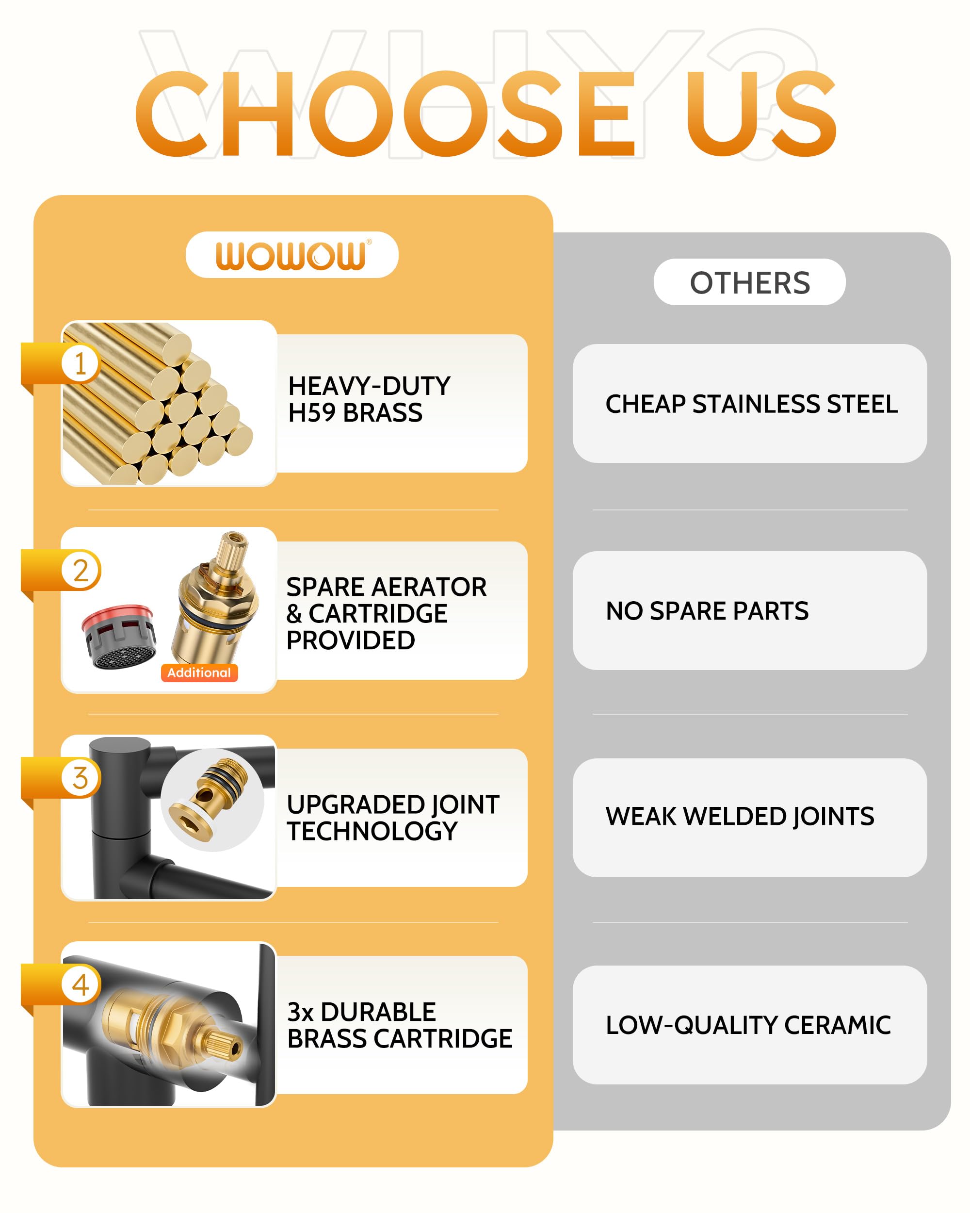 Leak Free Design: Dual brass cartridges turn smoothly and provide safer double flow control in use, preventing water dripping or leaking. Comes with 1pc spare brass valve for future replacement