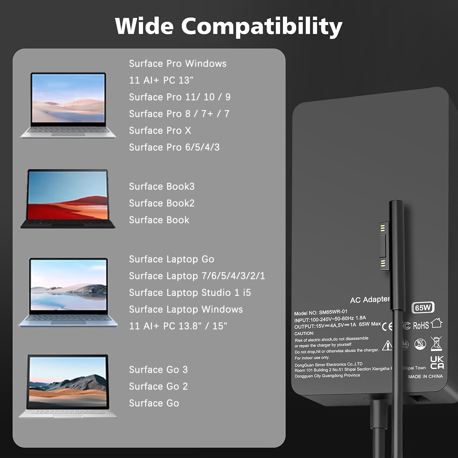 Extensive Compatibility: Our power adapter showcases broad compatibility,Compatible with Microsoft Surface Pro 11 10 9, 8, 7+, 7, 6, 5, 4, 3, X, and Windows Surface Laptop 7, 6, 5, 4, 3, 2, 1. It's also a perfect fit for Surface Book 3, 2, 1, and Surface Go 3, 2, 1, (44W, 39W, 36W, and 24W) keeping your entire Surface suite powered