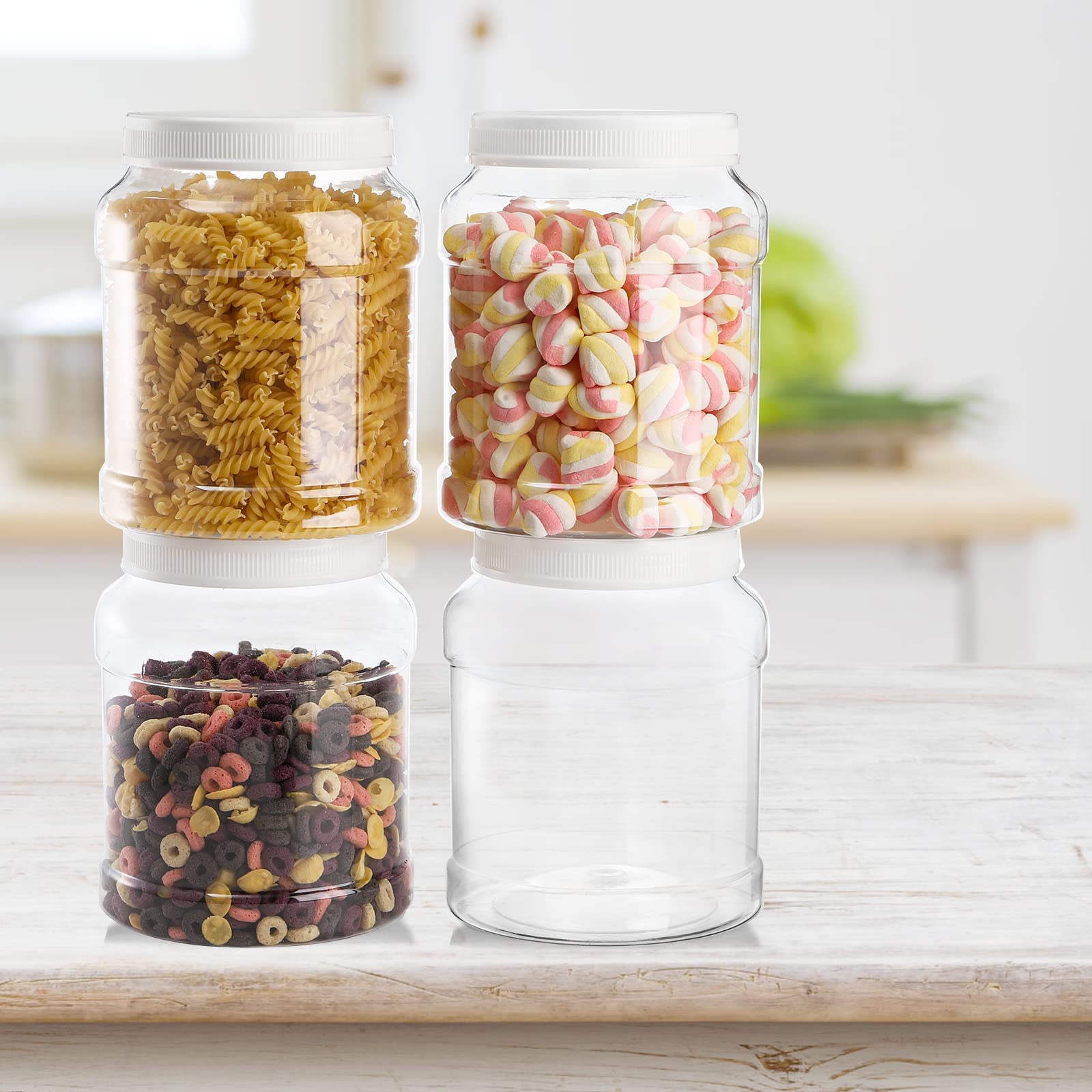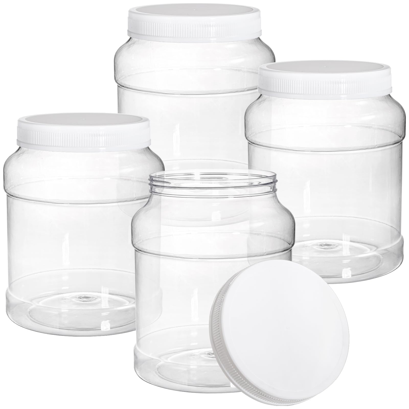 Our 4 pack 80 fluid oz empty plastic storage jars come with white screw on lid. Each round canister measures 7.0" tall, 5.7" in jar diameter and 4.6" in lid diameter. 80 fluid oz jar offers bulky storage capacity.