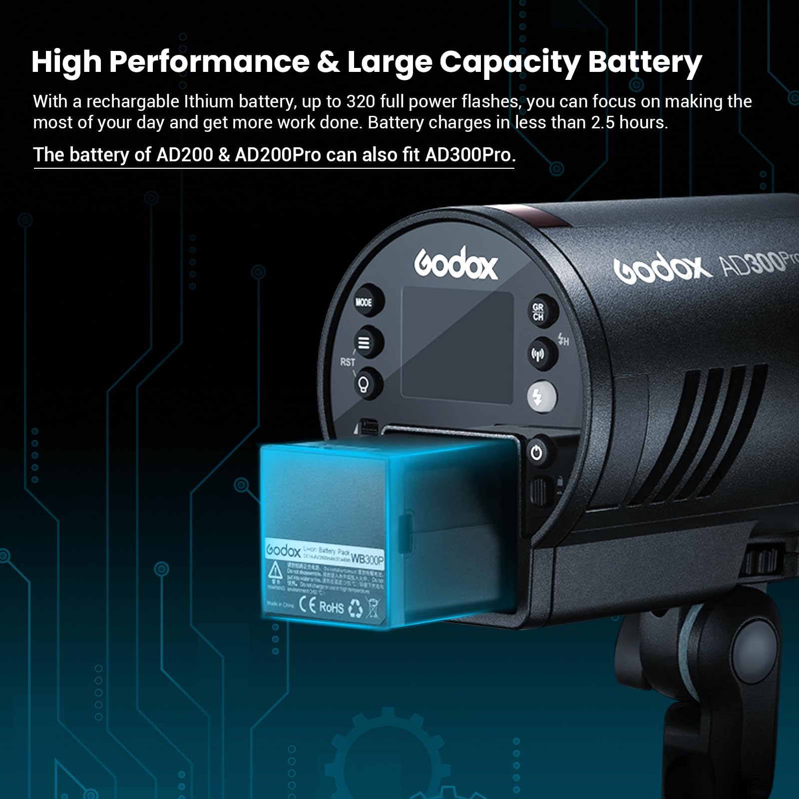 Large Capacity Battery: With high performance rechargeable lithium battery, meet the needs of long-term shooting and get more work done. Besides, fast charging let you get a lot of energy in a short time, NOTE: The battery of AD200 and AD200Pro can also adapt to AD300Pro