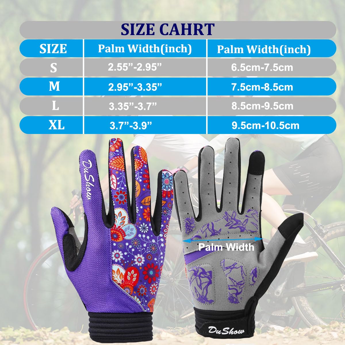 【UNIQUE WRIST DESIGN】---Elastic Hook and Loop strap around the wrist makes it easy to put on and take off.Terry cloth design on thumbs makes it easy to wipe away dripping sweat and keep your eyes on the road. Size(Palm Width):S:2.55"-2.95",M:2.95"-3.35'",L:3.35"-3.7".