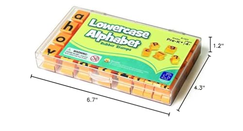 STAMP SET INCLUDES - 26 lowercase letter stamps and 4 punctuation marks in a durable, clear plastic storage case. A line at the bottom of each stamp helps with letter orientation. Ink pad not included
