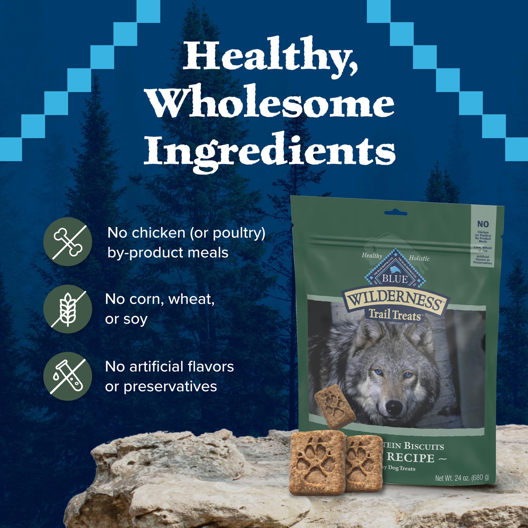 Contains: One (1) 24-oz bag of BLUE Wilderness Trail Treats High-Protein Dog Biscuits, Duck Recipe