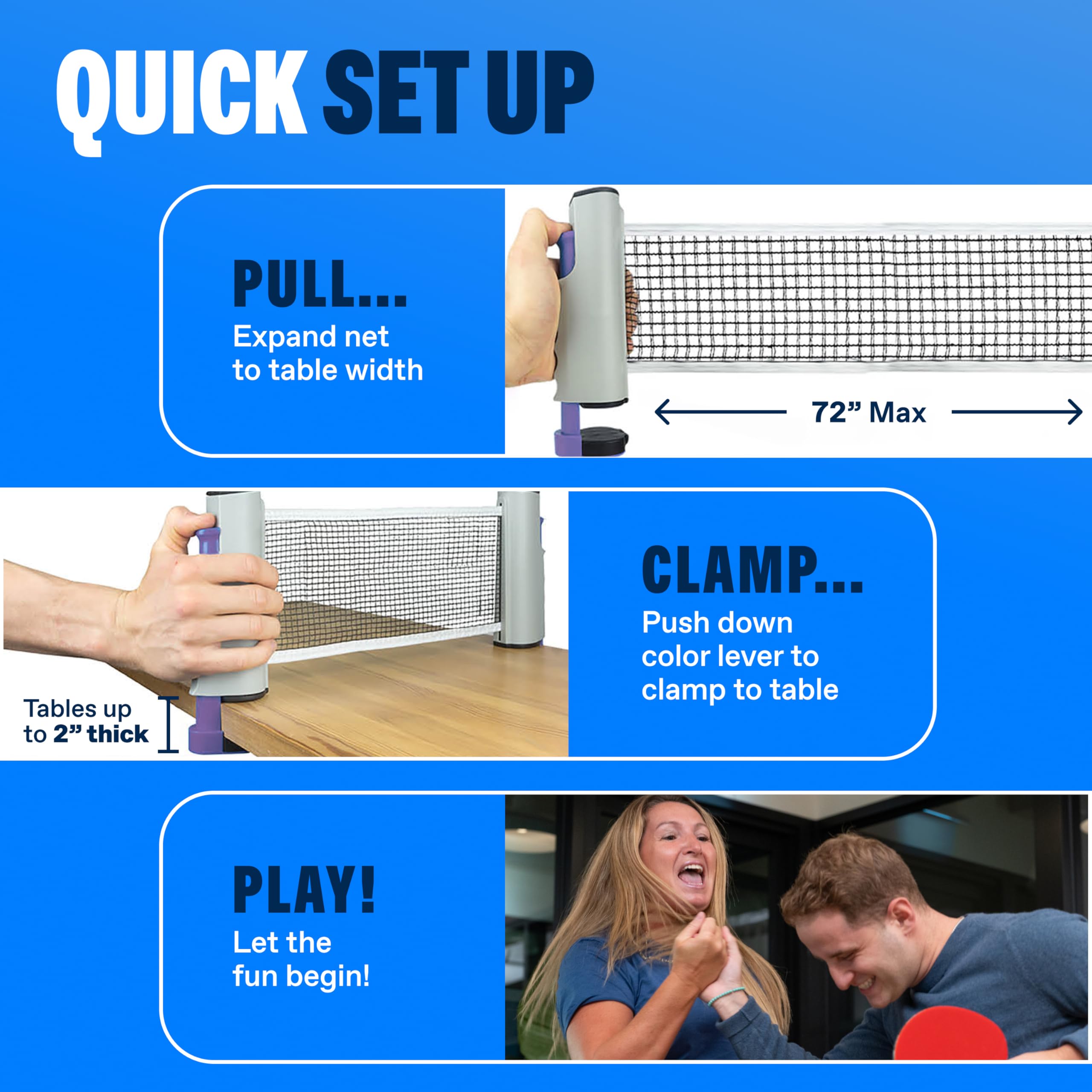 PORTABLE TABLE TENNIS NET - Turn any table into a ping pong table with our retractable net. No need for a full-size ping pong table! Versatile and lightweight, enjoy ping pong fun wherever you go. Experience thrilling matches and friendly competitions on any table, anytime!