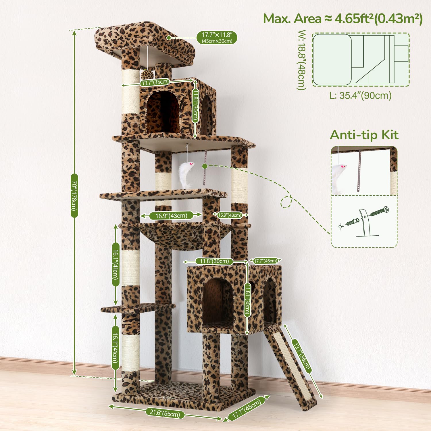 ENLARGED HAMMOCK - This cat tree is Equipped with a sturdy and spacious square hammock, this large cat tree tower offers a comfortable resting spot for your adult cat. The hammock design allows large cats to lie down, providing a relaxing space for napping and rejuvenation