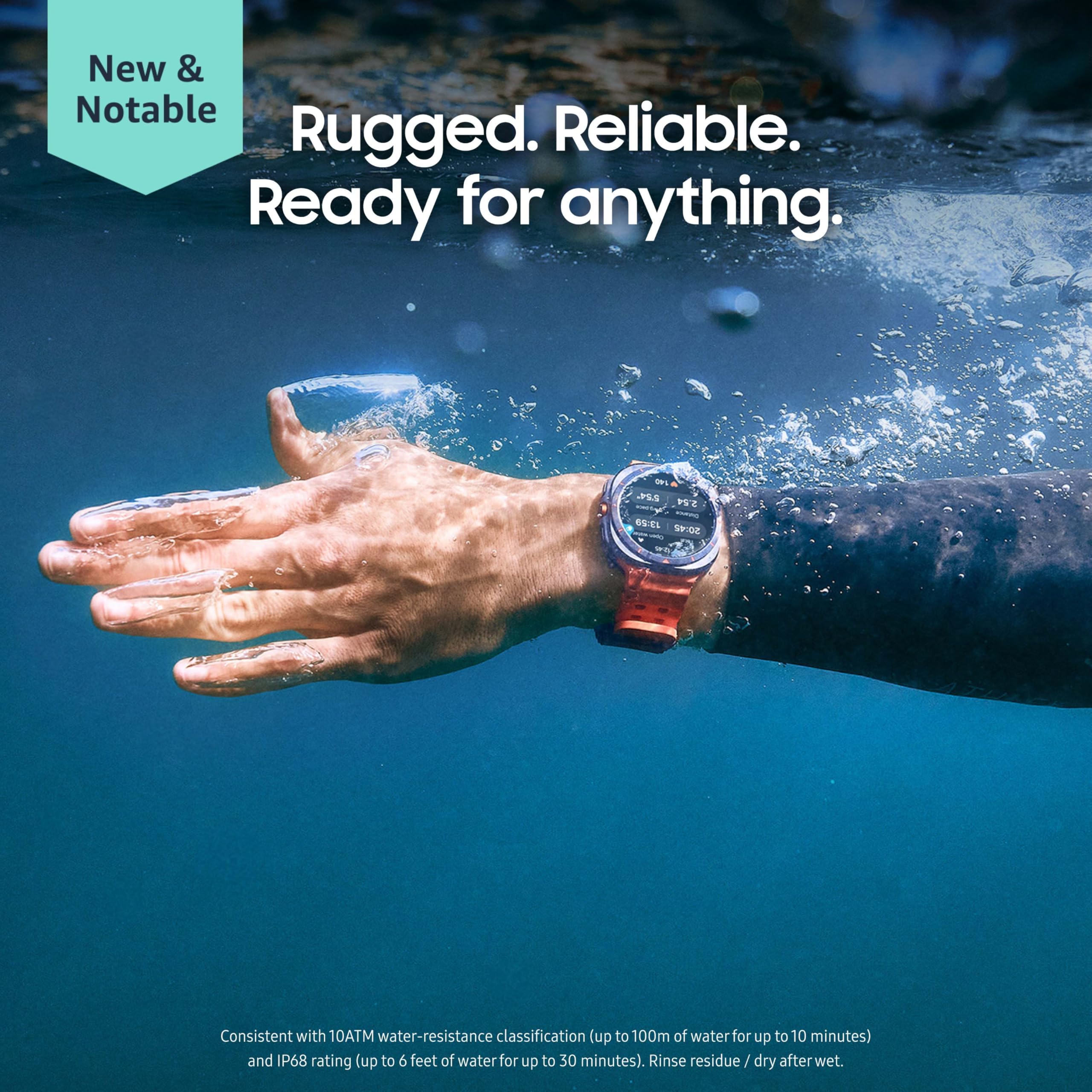 The Samsung Galaxy Watch Ultra is a rugged, feature-packed smartwatch built for outdoor adventures, boasting a titanium frame, sapphire crystal screen, massive 3000-nit AMOLED display, and extreme durability (10ATM water resistance, MIL-STD-810H compliant). It runs Wear OS, features a powerful processor, offers long battery life (up to 100 hrs in Power Saving), includes advanced health tracking (ECG, body composition, sleep), GPS, and integrated AI features for fitness insights, alongside a customizable Action Button for quick actions.
