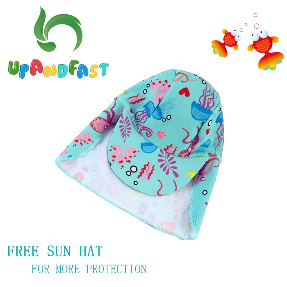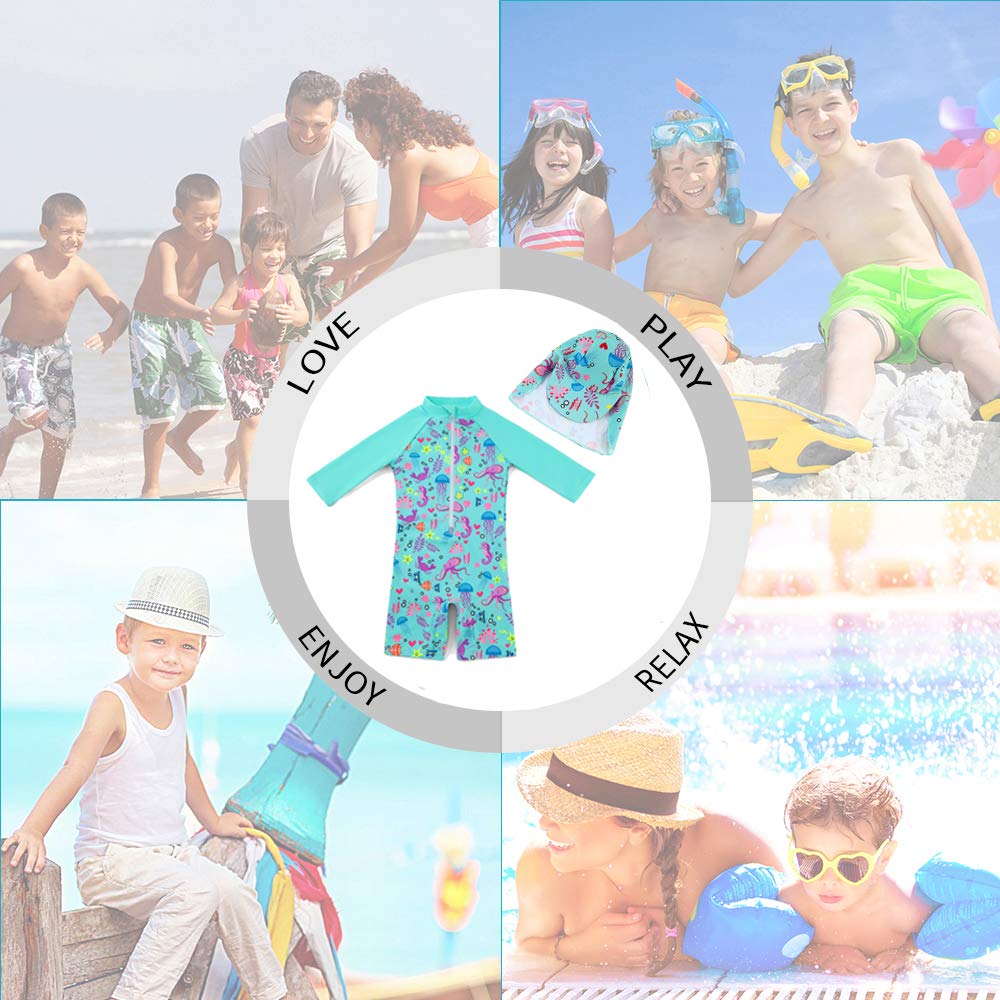 CUTE SUN HAT: Toddler rash guard that comes with a lovely hat, it covers baby's delicate face and neck. which can give baby more protection when playing at the sea, beach or under the sun