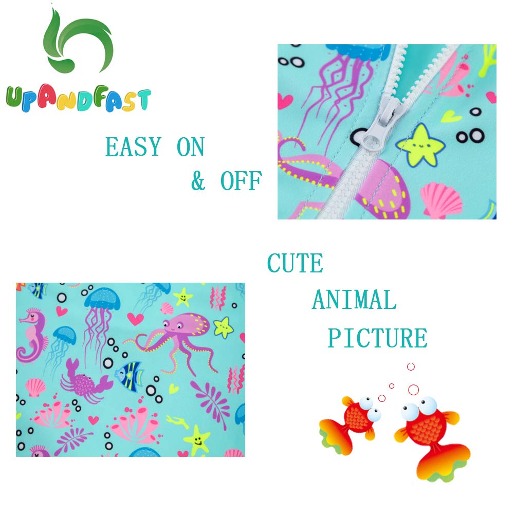 HUMANIZATION DESIGN: This one-piece baby bathing suit has a front / back zip for convenient putting on and taking off. Zipper flap and garage protect your baby's delicate skin