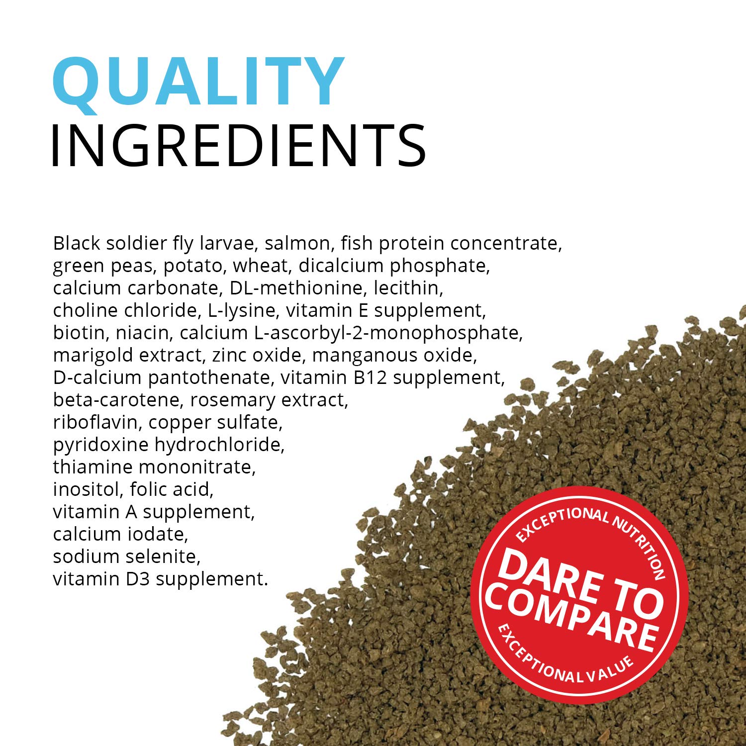 Tropical fish food that contains up to 40%, nutrient-rich Black Soldier Fly Larvae, the first ingredient