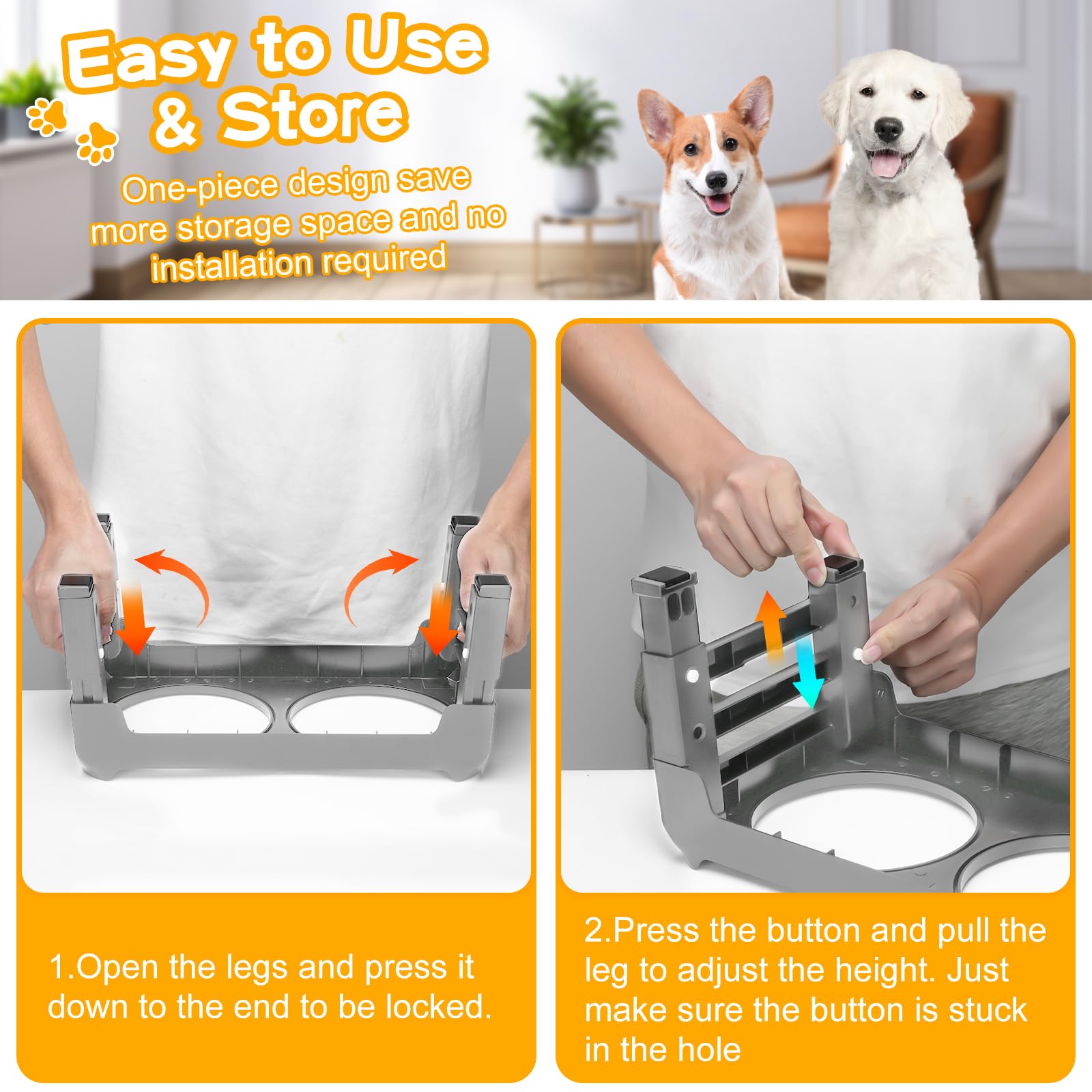 🐕No Installation & Folds Up Nice for Traveling: The detachable design and foldable legs make it easy to pack and much space-saving, perfect for both home and travel. No assembly required. Simply unfold the legs and press down to use. Adjusting the height is a breeze too – just press the white button and pull the legs to your desired height.