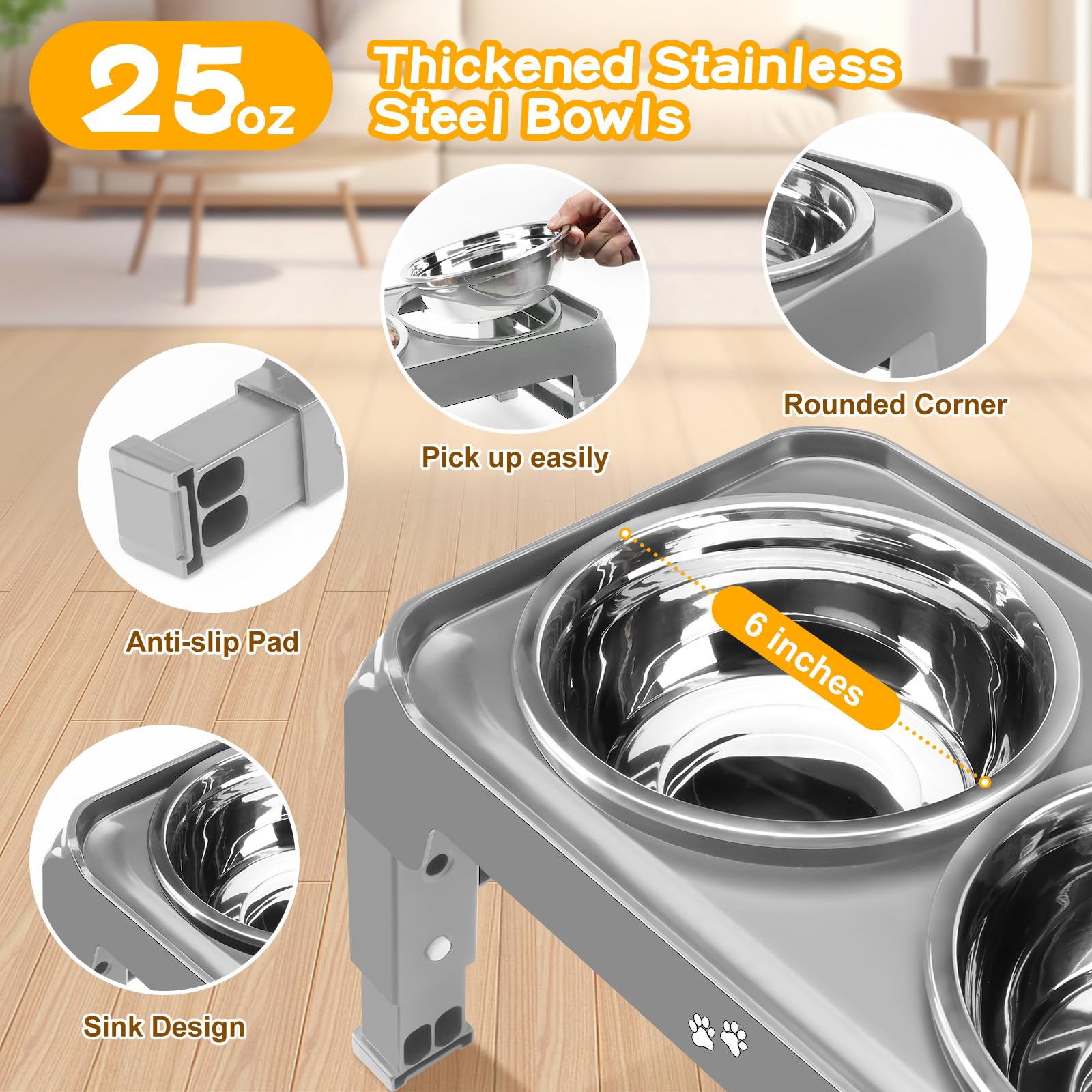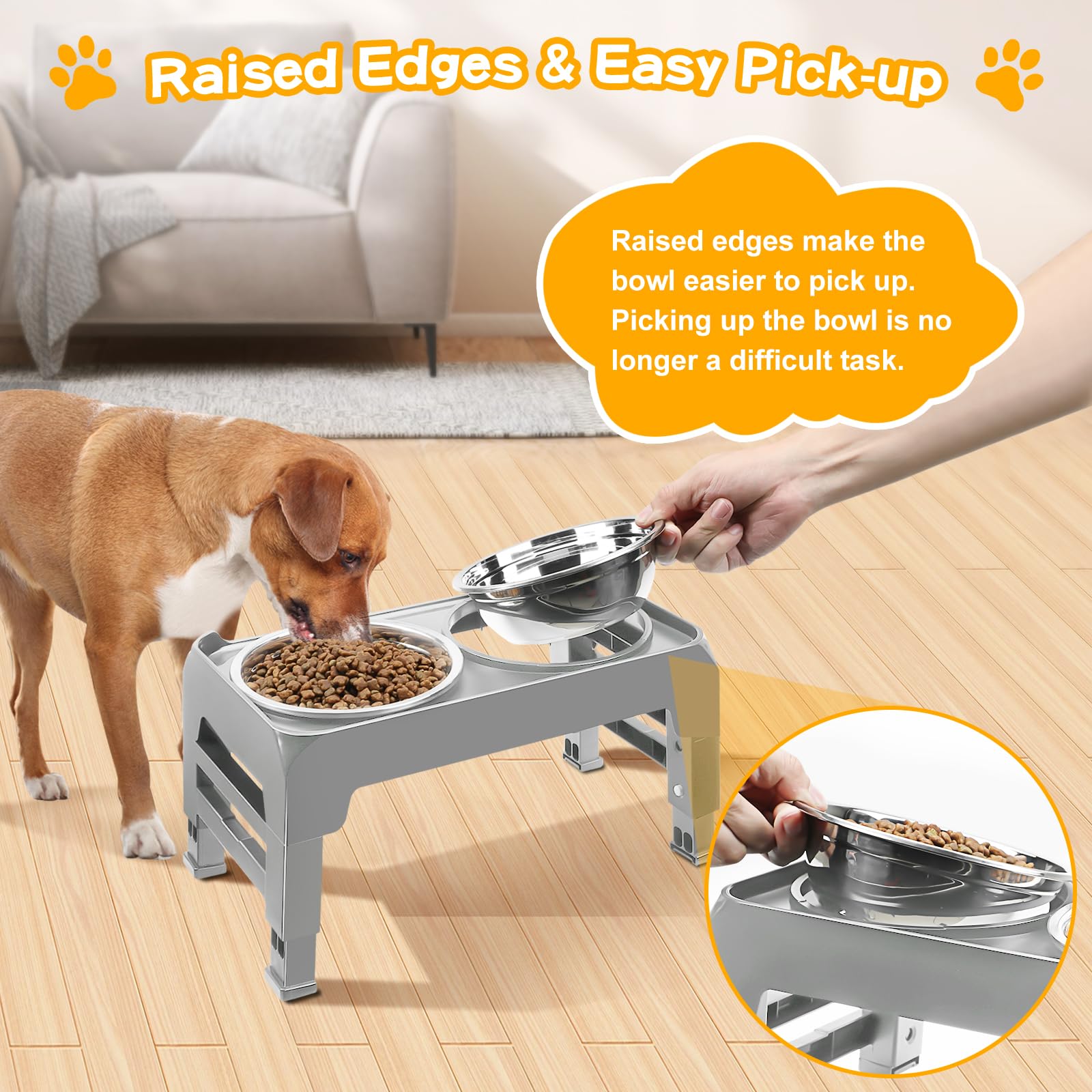 🐕Adjustable Height Dog Bowl Stand for Small & Medium Dogs: Say goodbye to bending down! Our small elevated dog bowls can be adjusted to 3 different heights: 2.75", 6", 7.5", accompany then from puppy to full grown. The raised dog bowl can not only makes it easier and comfortable for dogs to access their food and water, but also prevents dust or floor debris from falling into the bowls, ensuring a clean and healthy dining experience.