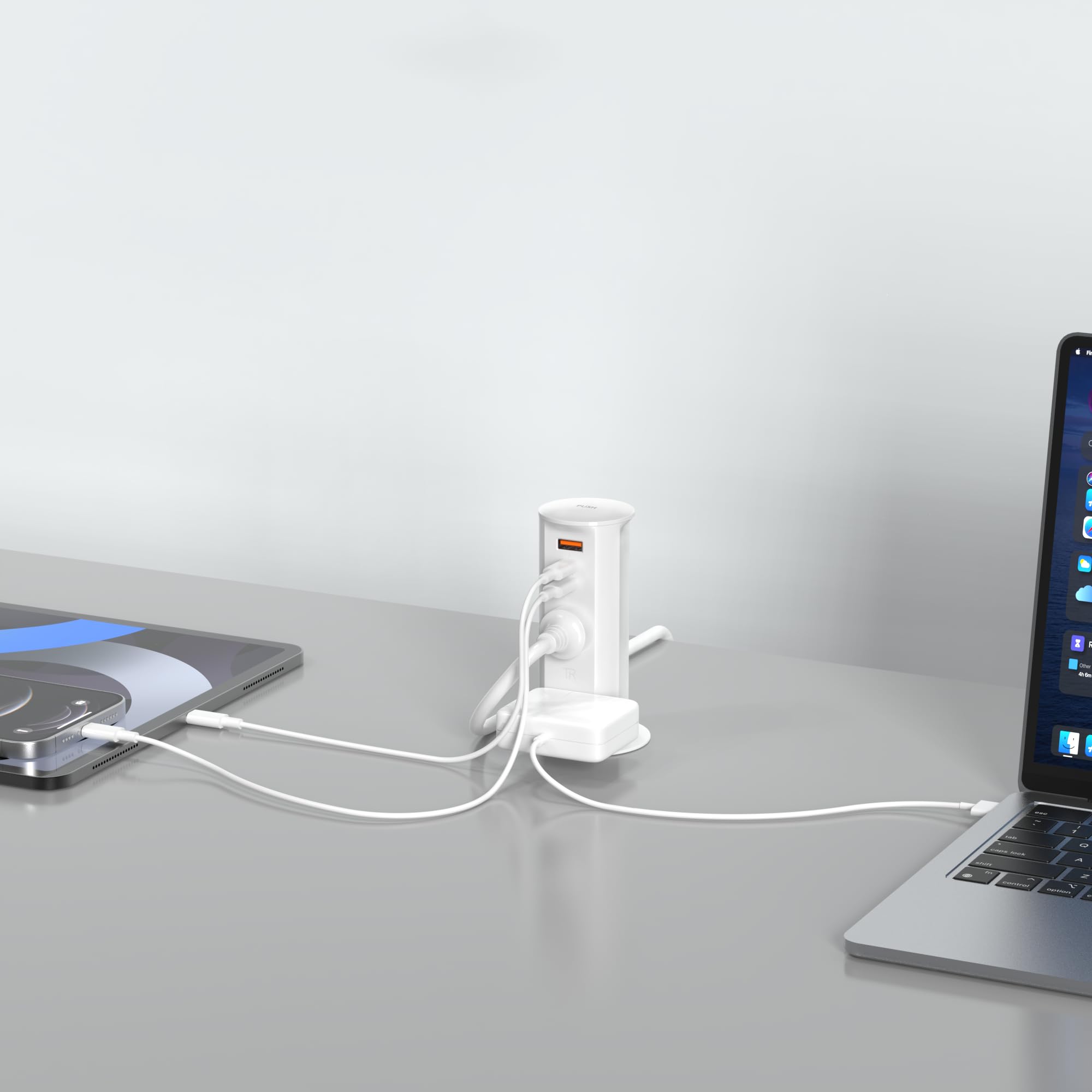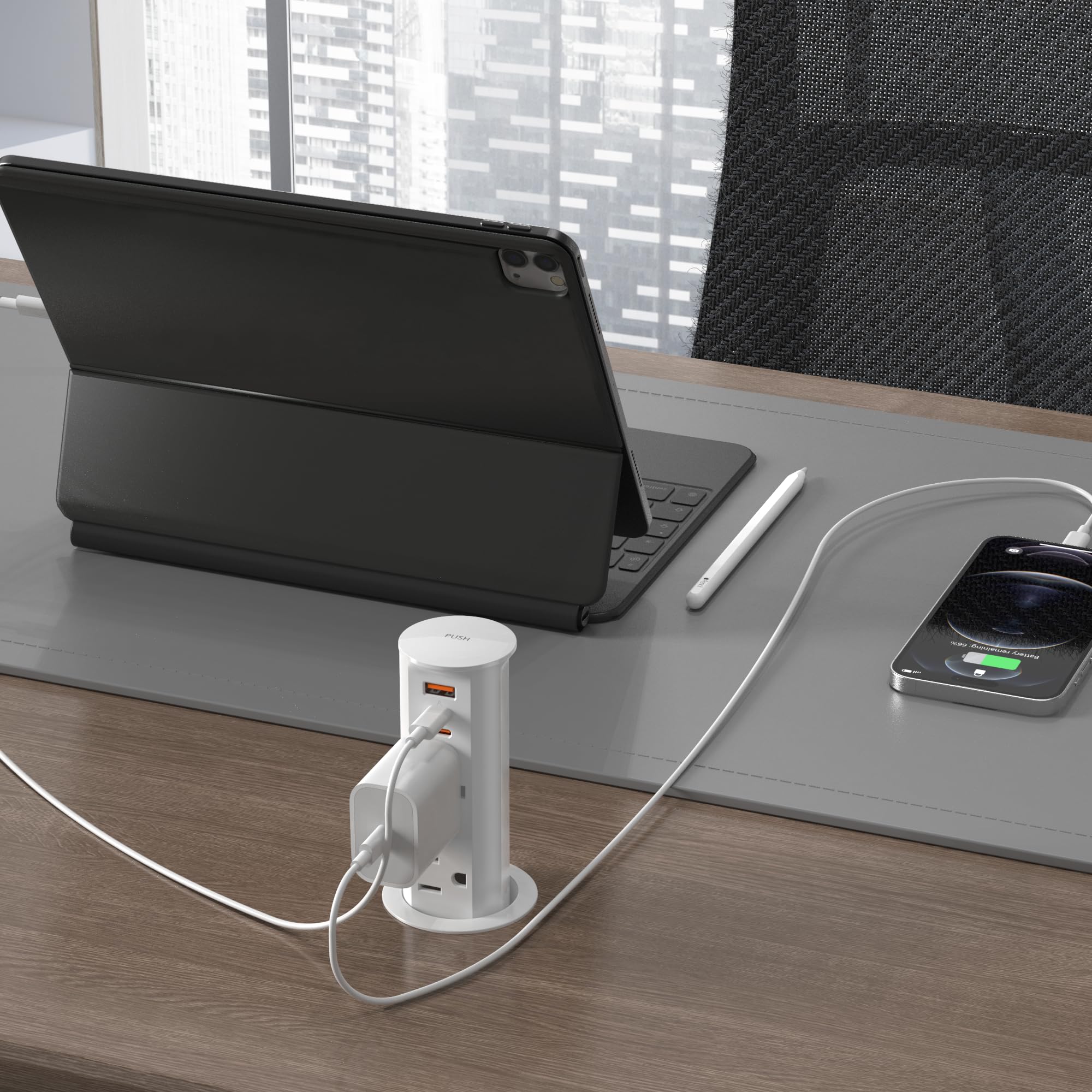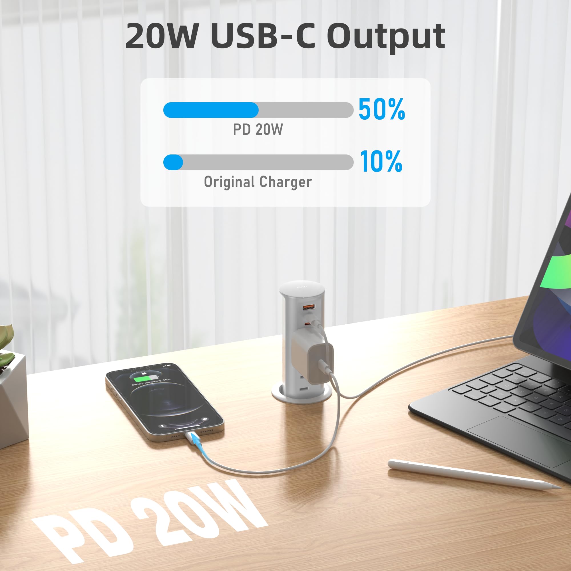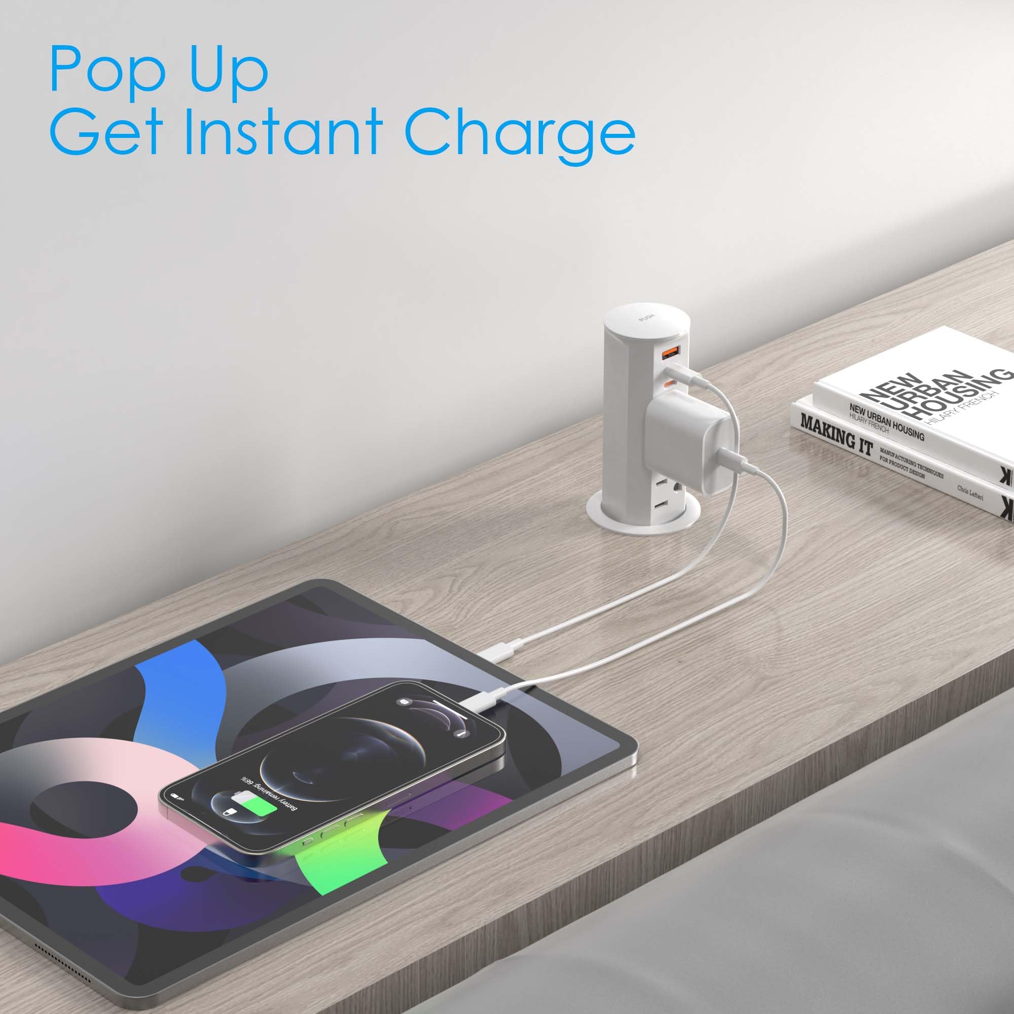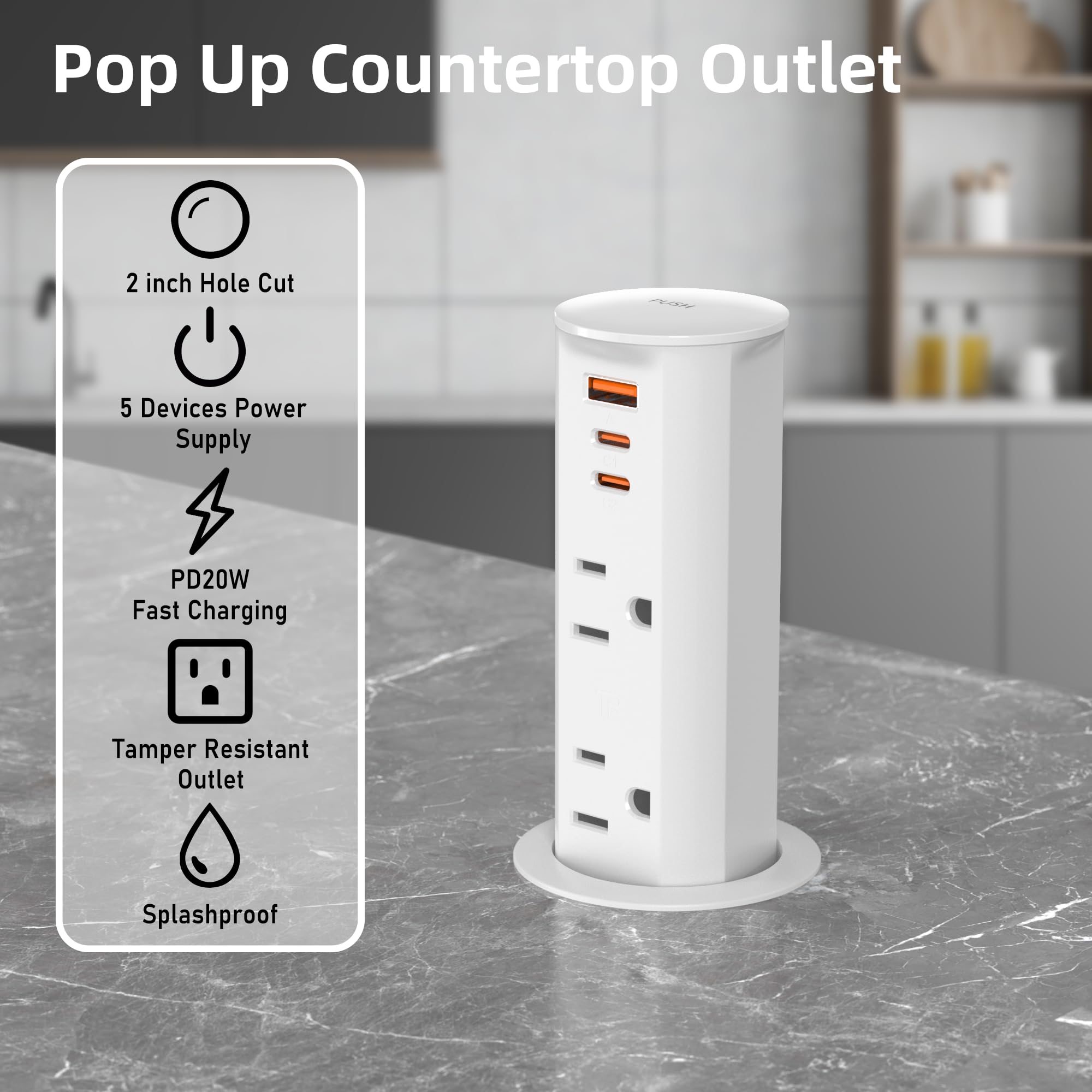 A gentle press on the top and charge at arm's reach from your desk. No more climbing under desk, weaving power cords through hole for power. The pop up countertop outlet features 2 12 amp rated receptacle for powering appliances and 20W power delivery USB ports for fast and stable charging your phones. Provides multiple options when you need more than one plug at a time.
