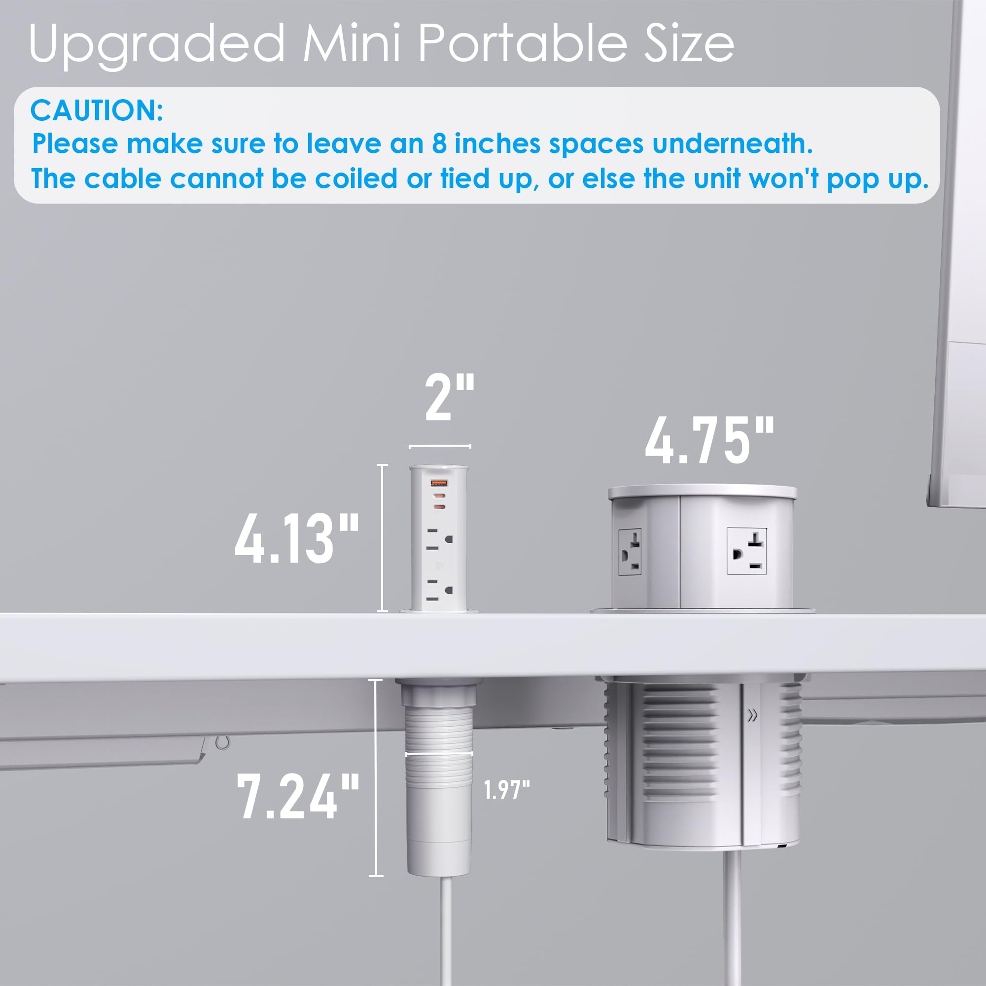 The pop up receptacle is of sleek appearance and portable desgin. When you need the full desk surface, tuck it away out of sight under the desk (plus, it is splash resistant). Meet the new codes to prevent cords going over the edges on the sides of island. You'll get more space utilization on the counter, which is space saving and clutter-free. It will sink to 8 inches beneath your countertop. Please check the bottom size of your desk or table before you purchase.