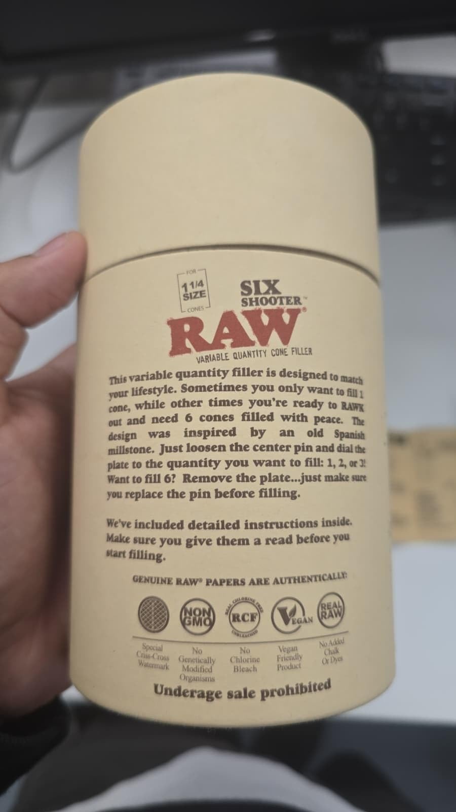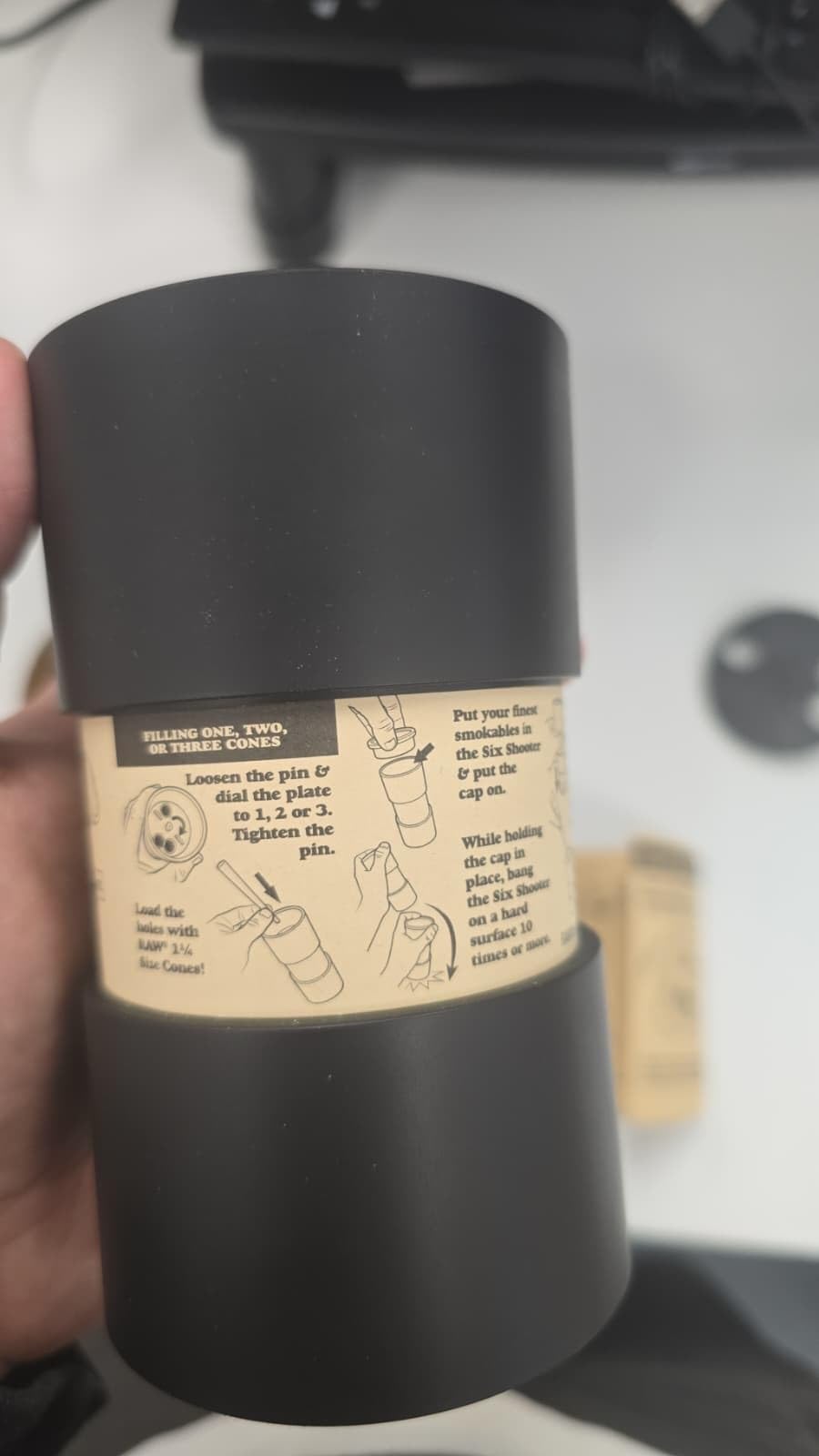 Compatibility | The Six Shooter fits 1 1/4 Sized Cones such as RAW's Classic 1 1/4 Size or Organic 1 1/4 Sized cones. The recommended cone size is 83mm in length