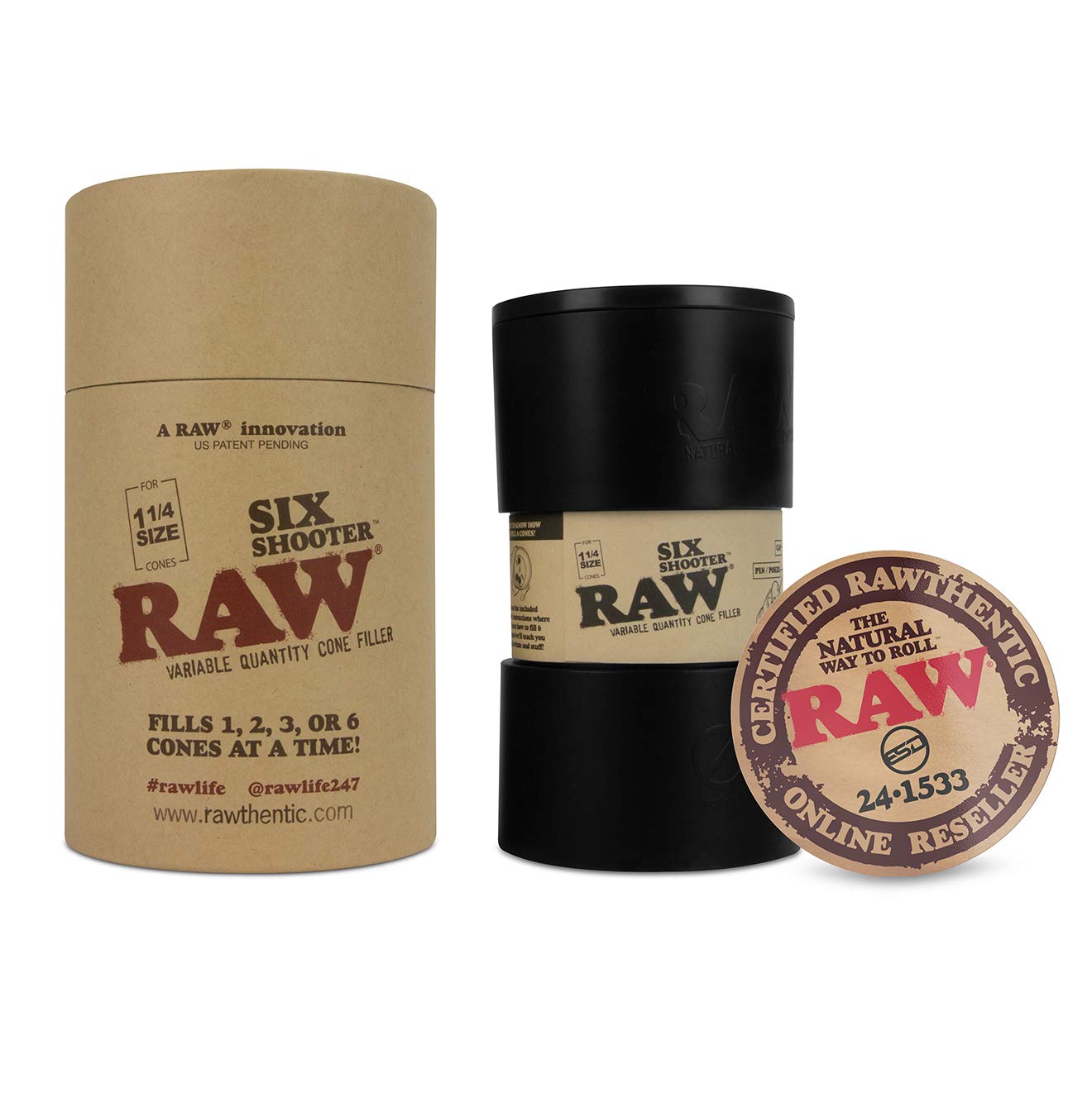 Functional | Can roll one, two, or six king-size RAW cones in less than one minute! The Six Shooter gives you the luxury of filling pre-rolled cones without making a mess or wasting herbal blends in the process. Also serves as a cone storage.