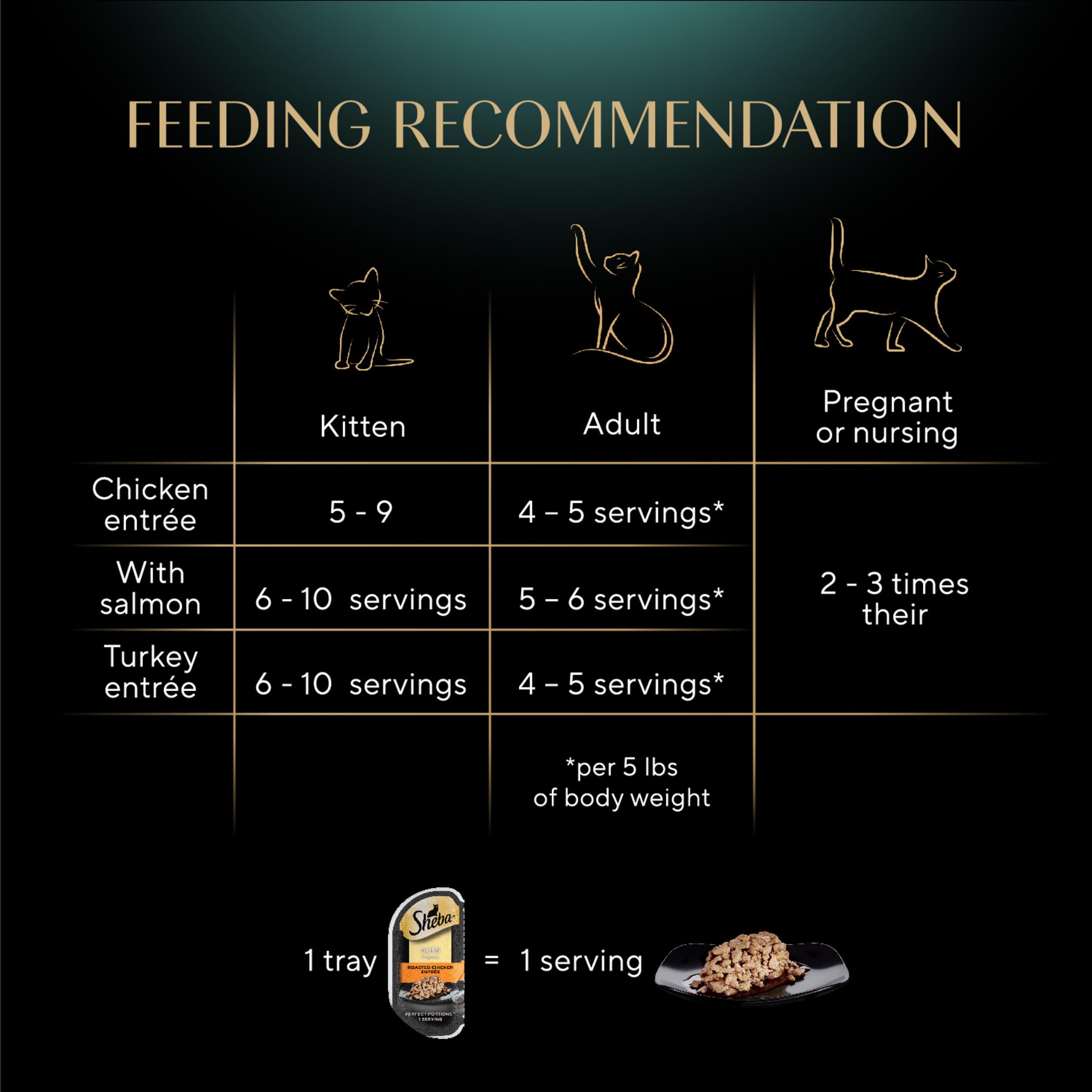 Cats know what they want: the delicious taste of Sheba Perfect Portions Wet Cat Food Cuts In Gravy. The succulent cuts of roasted Chicken, tender Turkey, or with sustainable Salmon in a delicious gravy deliver a wet cat food your feline will love. Sheba Perfect Portions Wet Cat Food has two convenient, portioned trays for a delicious serving with zero messy leftovers every time. Sheba Wet Cat Food is formulated without grains, corn, or soy and contains no artificial flavors or preservatives; although trace amounts may be present due to cross-contact during manufacturing. Even the pickiest cat is sure to enjoy it. Savor every delicious moment with Sheba Wet Cat Food Cuts in Gravy.