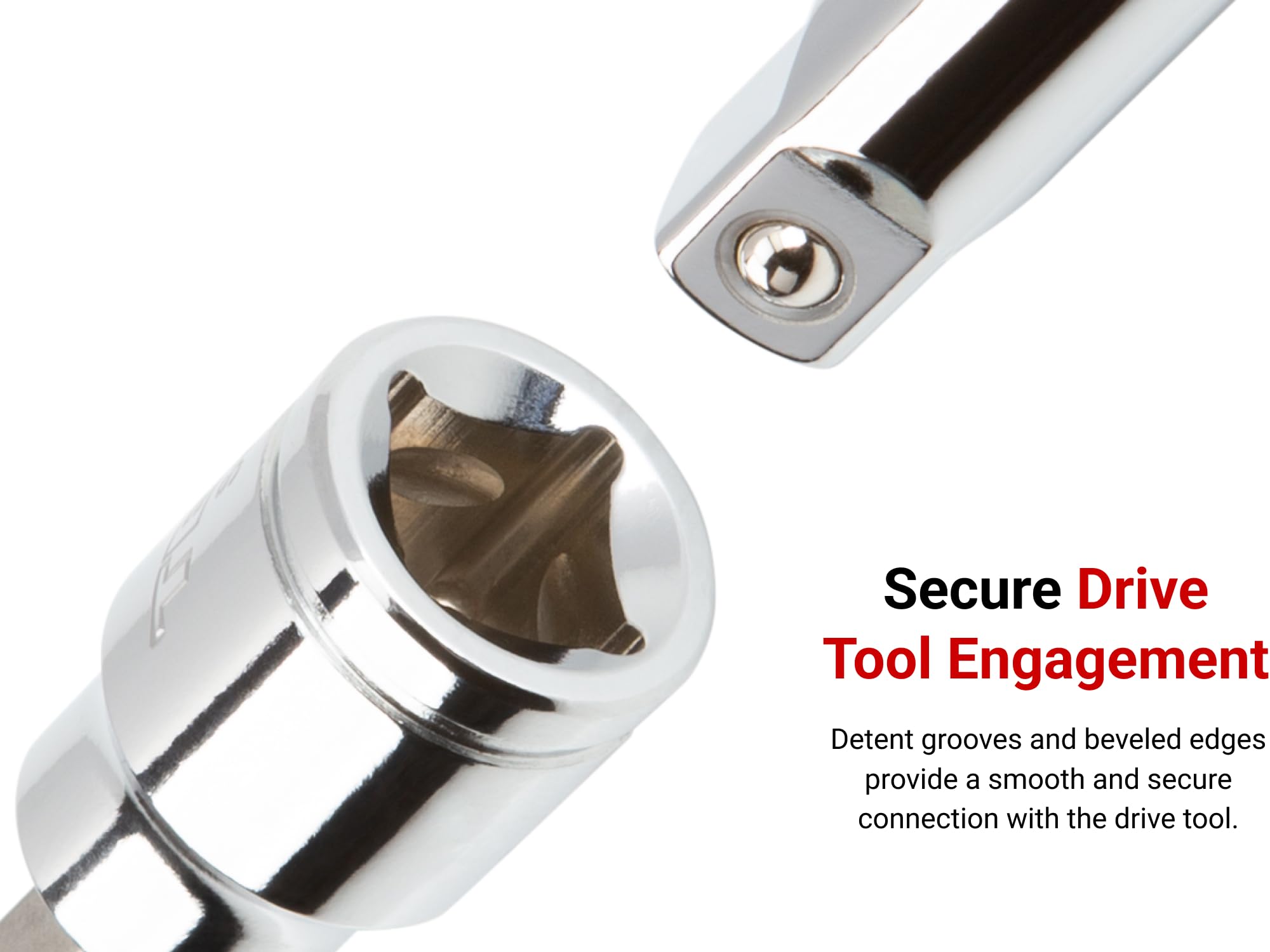 Tekton S2 steel bits are press-fit into the socket for a straight, permanent connection that can't loosen over time. The star-shaped Torx(R) bit has 6-lobes machined to precise tolerances for an exact, high-torque fit that resists camming out. The set includes a twist-to-lock socket rail to keep the sockets securely organized.