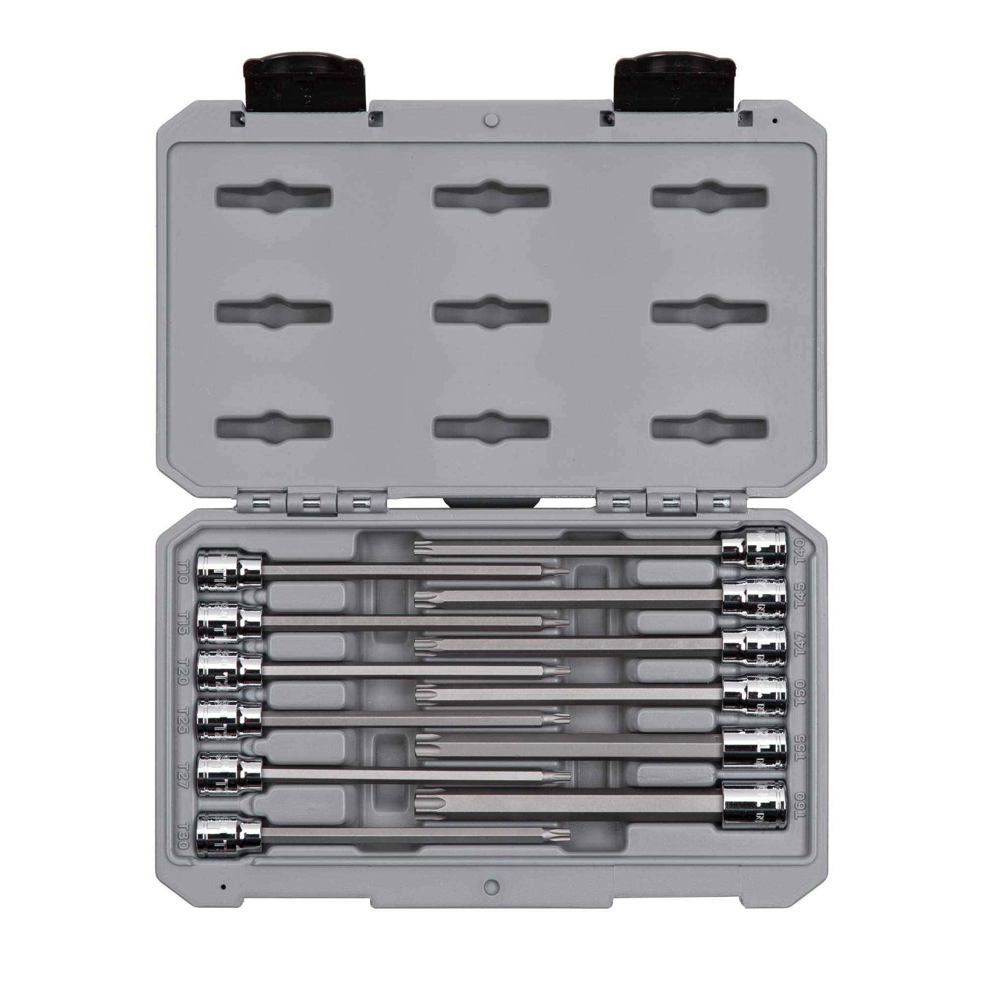 Includes 12-pc. 3/8 in. drive Torx bit sockets: T10, T15, T20, T25, T27, T30, T40, T45, T47, T50, T55, T60; Socket rail