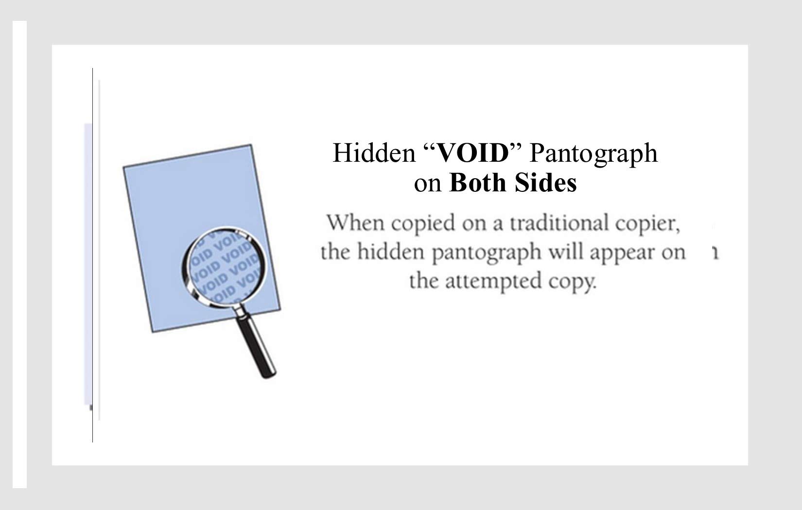 Security Features: Hidden VOID Pantograph on BOTH SIDES, Uniform Background and Erasure Protection
