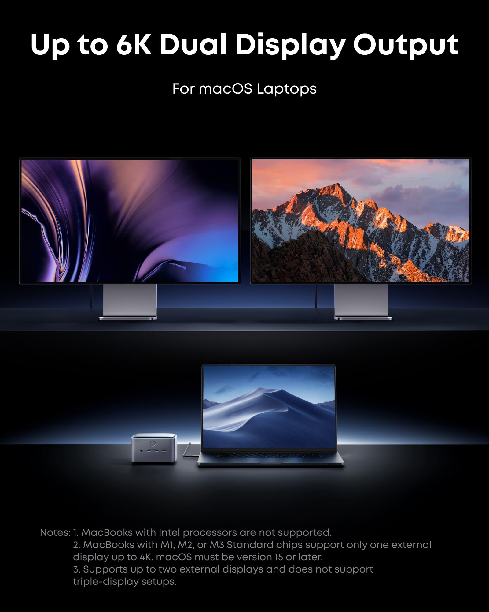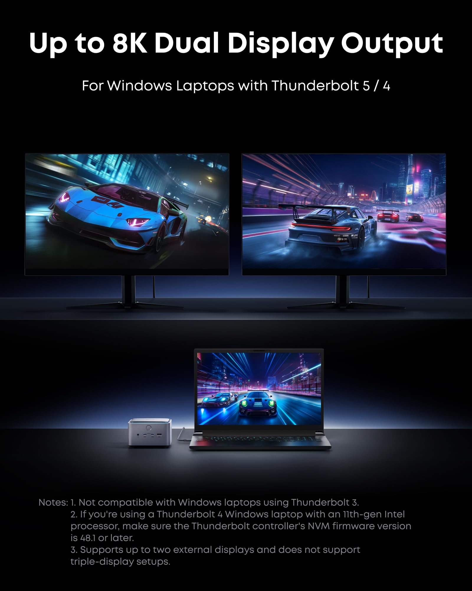 Dual Display Docking Station: Supports one HDMI or DisplayPort and two Thunderbolt 5 downstream video outputs. Delivers up to 8K@60Hz for a single display, or dual 8K@60Hz for Thunderbolt 5 Windows laptops. (Note: Windows laptops that support only DisplayPort Alt Mode (not Thunderbolt 5 or 4), and MacBooks with standard M1, M2, or M3 chips, support just one external display.)