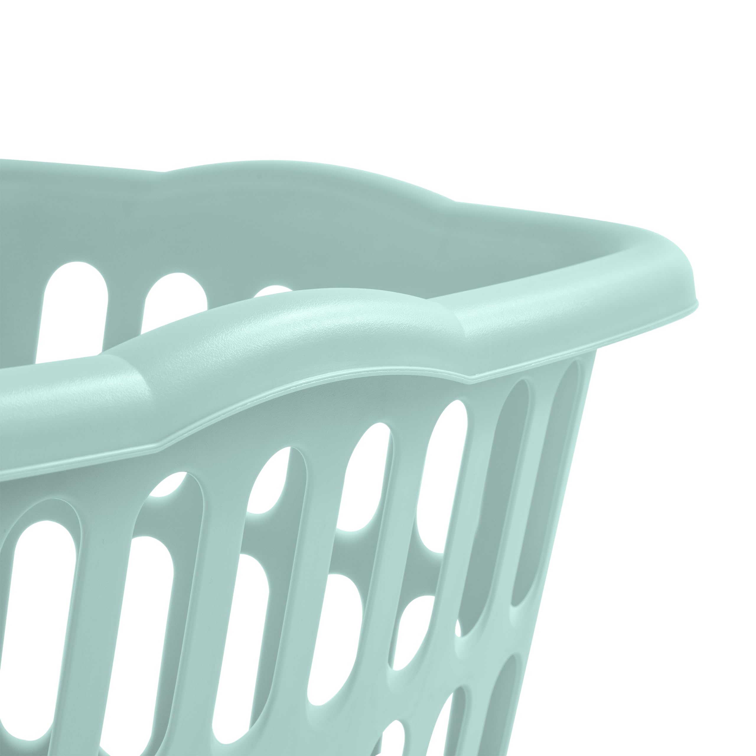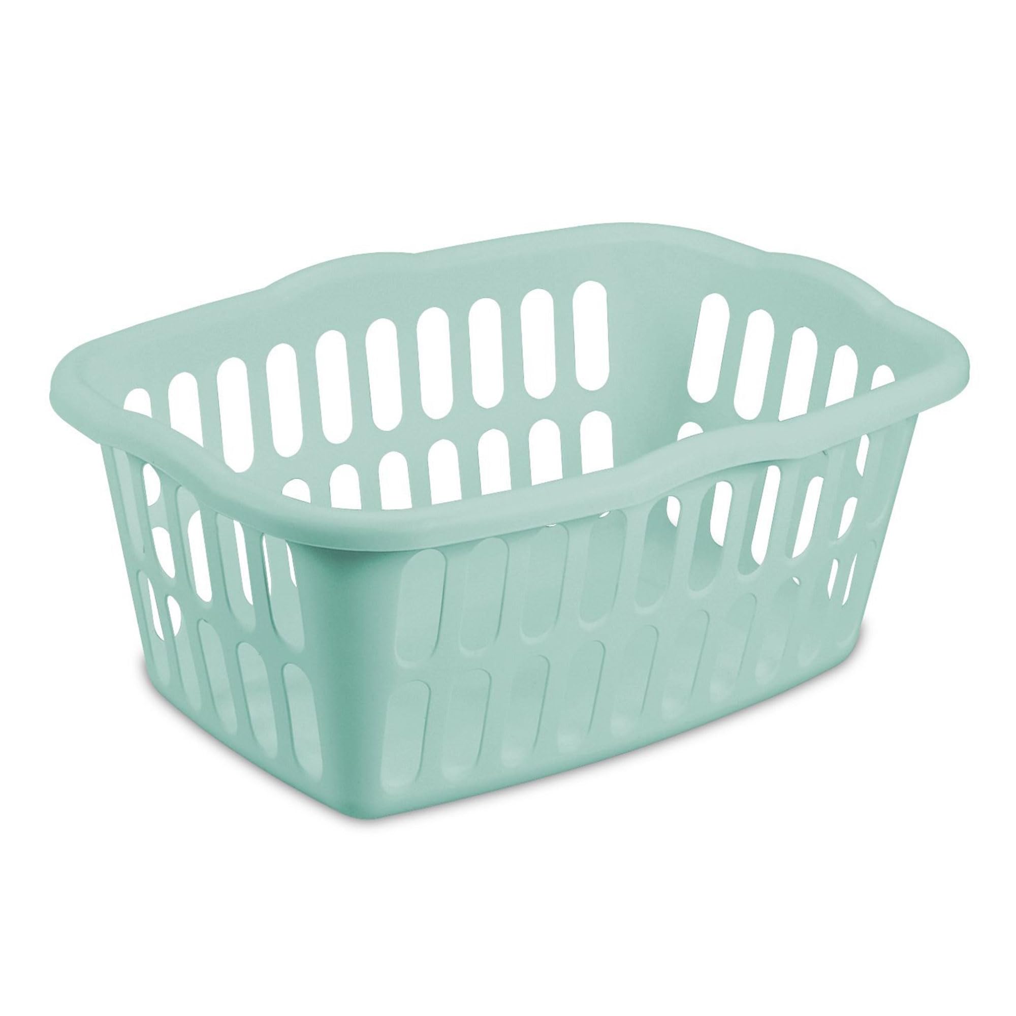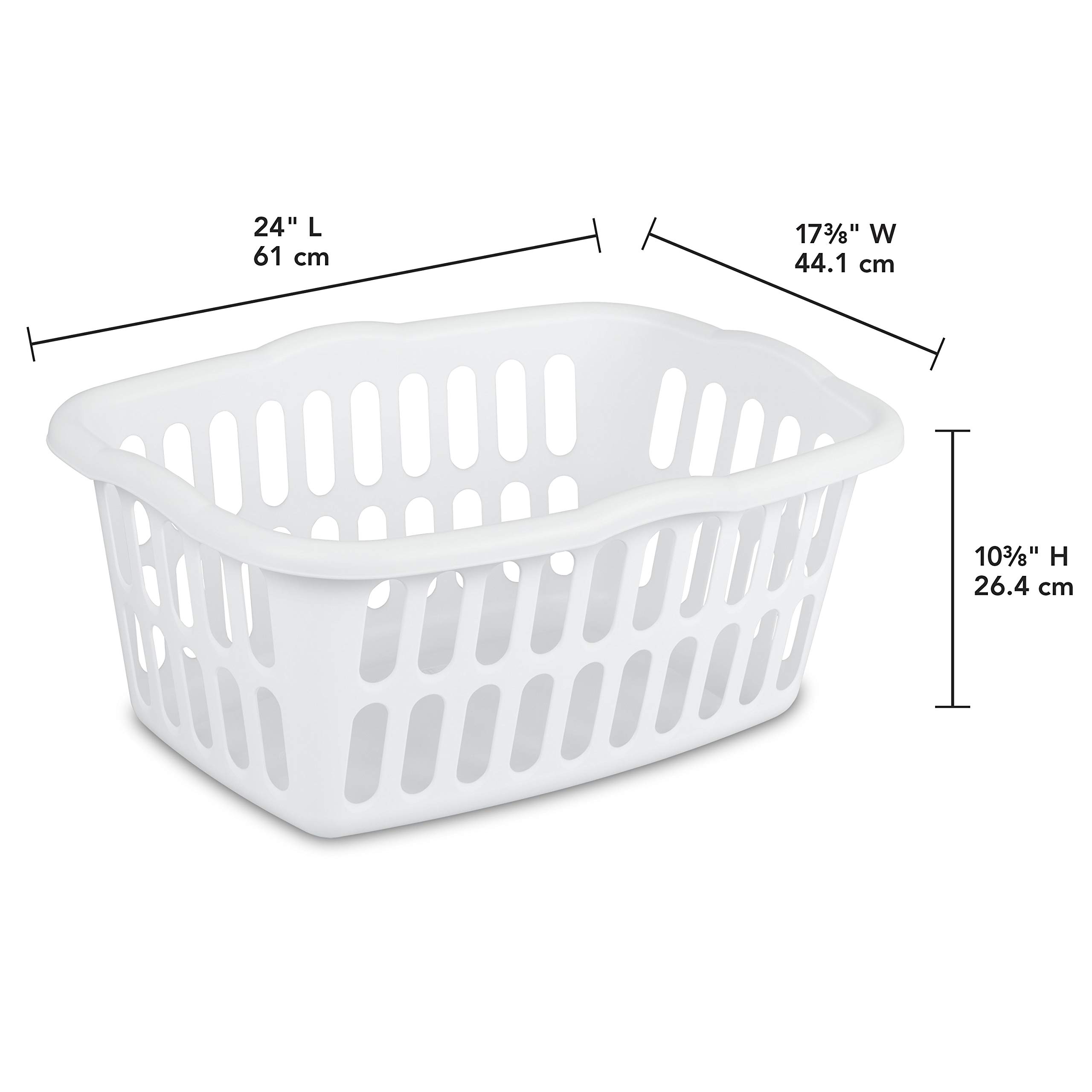 Product Description The Sterilite 1.5 Bushel Rectangular Laundry Basket features a classic design, and is a great solution that satisfies common laundry needs throughout the home. This basket includes contoured grip surfaces on all four sides that add comfort and ease when lifting and carrying through doorways, hallways, and up & down stairs. The large, oval hole pattern increases air flow for added ventilation. Its durable design will hold up to your regular day-to-day use, while the smooth plastic interior is snag proof and easy to clean. Ideal for use in the bedroom, bathroom, laundry room or for transporting clothes between locations. When not in use, the laundry baskets stack neatly and nest together creating more efficient storage space in your home. The overall assembled dimensions of this item are 24" L x 17 3/8" W x 10 3/8" H. From the Manufacturer 1.50 Bushel Rectangular Laundry Baskets. 6 White, 6 Aqua Chrome. The baskets combine value and quality to provide an economical laundry solution. The basket offer contoured grip surfaces for comfort and ease when carrying heavy loads to and from the laundry room.