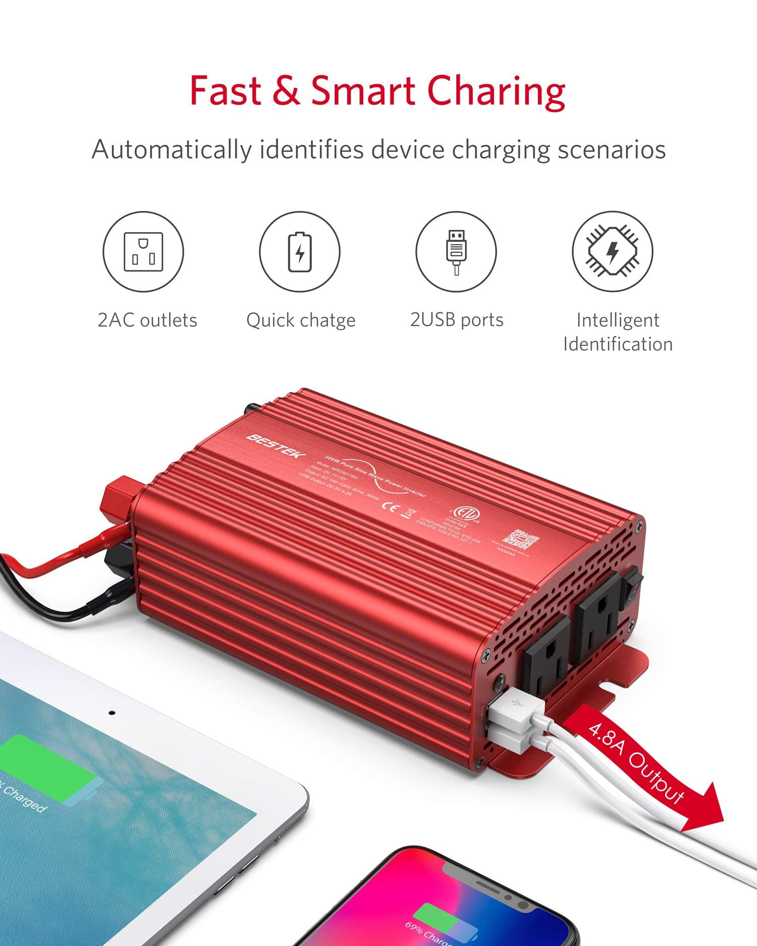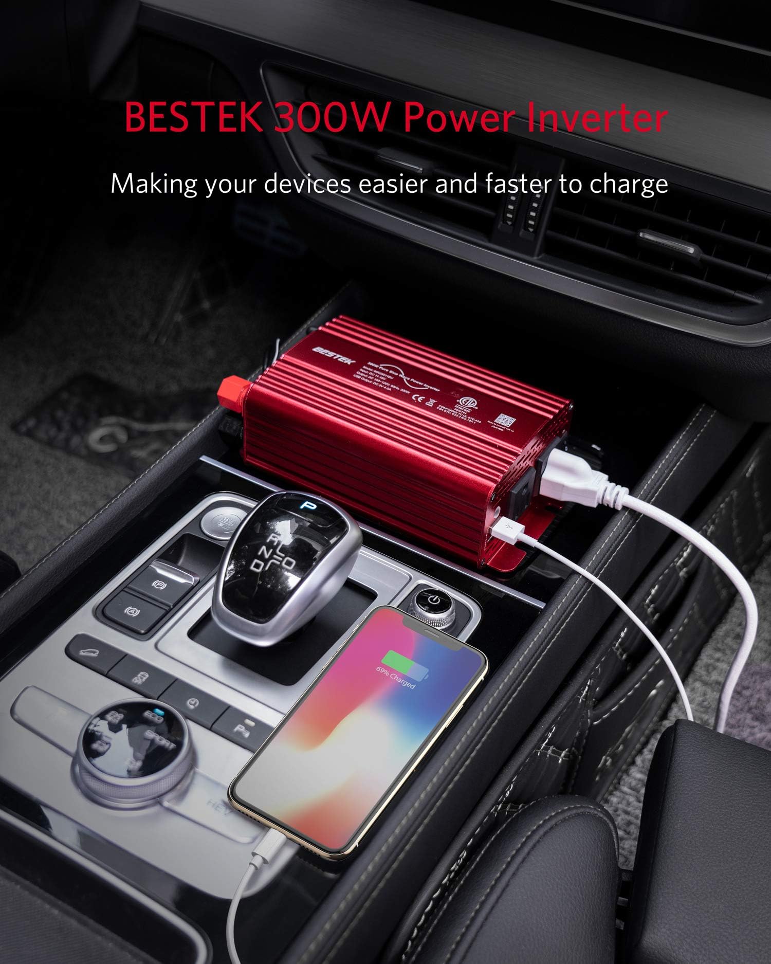 BESTEK 300W pure sine wave car inverter:Its output waveform is same as the AC power waveform of mains power grid which delivers a smoothly-varying sine wave for sensitive electronics provided by the electric utility.Perfects for off-grid system,Lower THD,Less wear,Strong inductive loads capability.It has little interference with radios, communication and precision equipment.It's also recommended by most cordless tool manufacturer that a pure sine wave inverter is used to ensure long battery life