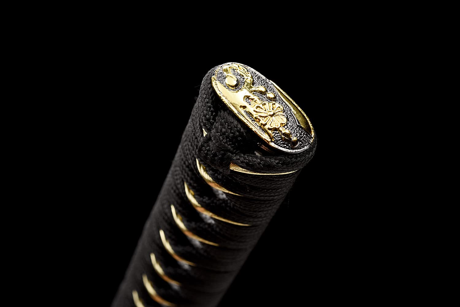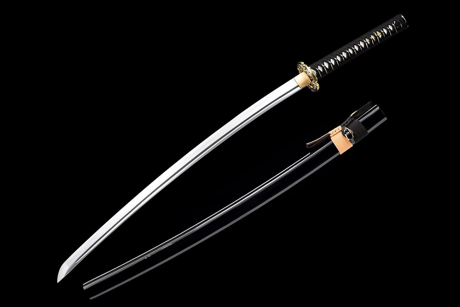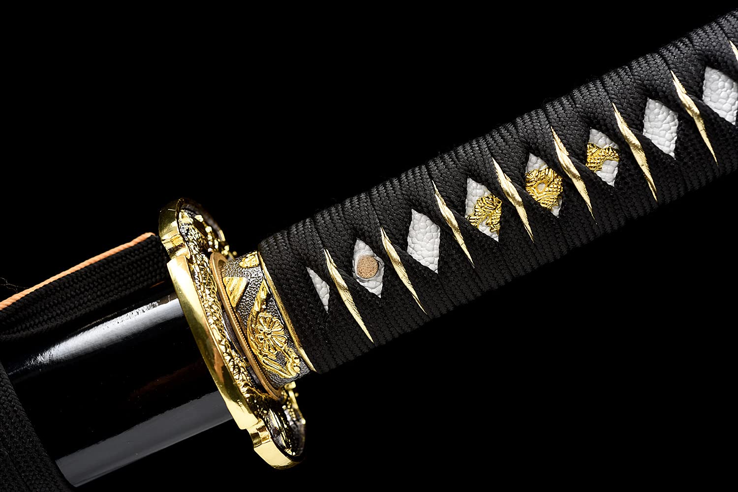 MATERIALS: To avoid fading and discolouration, Tsuba(Guard) is made of alloy material. The Handle(Tsuka) is made of Dirt-resistant black thin Ito that absorbs sweat. For refining, Clay Tempering Process is used for this Samurai Sword, with the Real Blade Grain(Hamon). Other materials include black imitated rayskin, High Quality Wooden Sheath and gray-painted Saya(Scabbard).