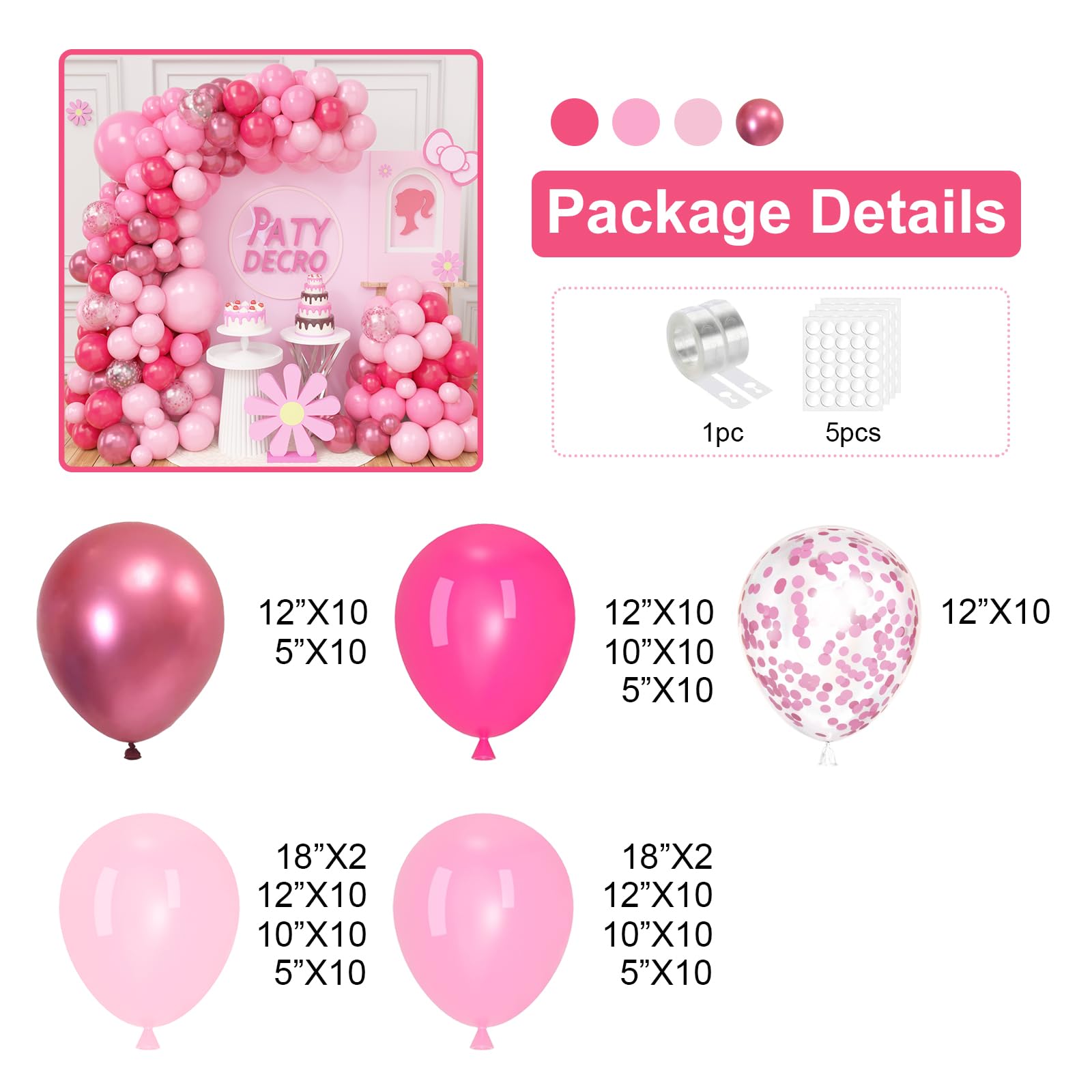 【DIY Balloons Package List】: The hot pink balloon arch kit come with 124pcs Various pink balloons, including 4 different sizes: hot pink balloons x 32pcs, metallic pink balloons x 20pcs, pink confetti balloons x 10pcs, pink balloons x 32pcs, light pink balloons x 30pcs, Balloon garland strip x 1 roll (16 feet) and 100pcs balloon glue dots, The hot pink balloons backdrop is very beautiful and stylish. You can DIY your pink balloons according to your need.
