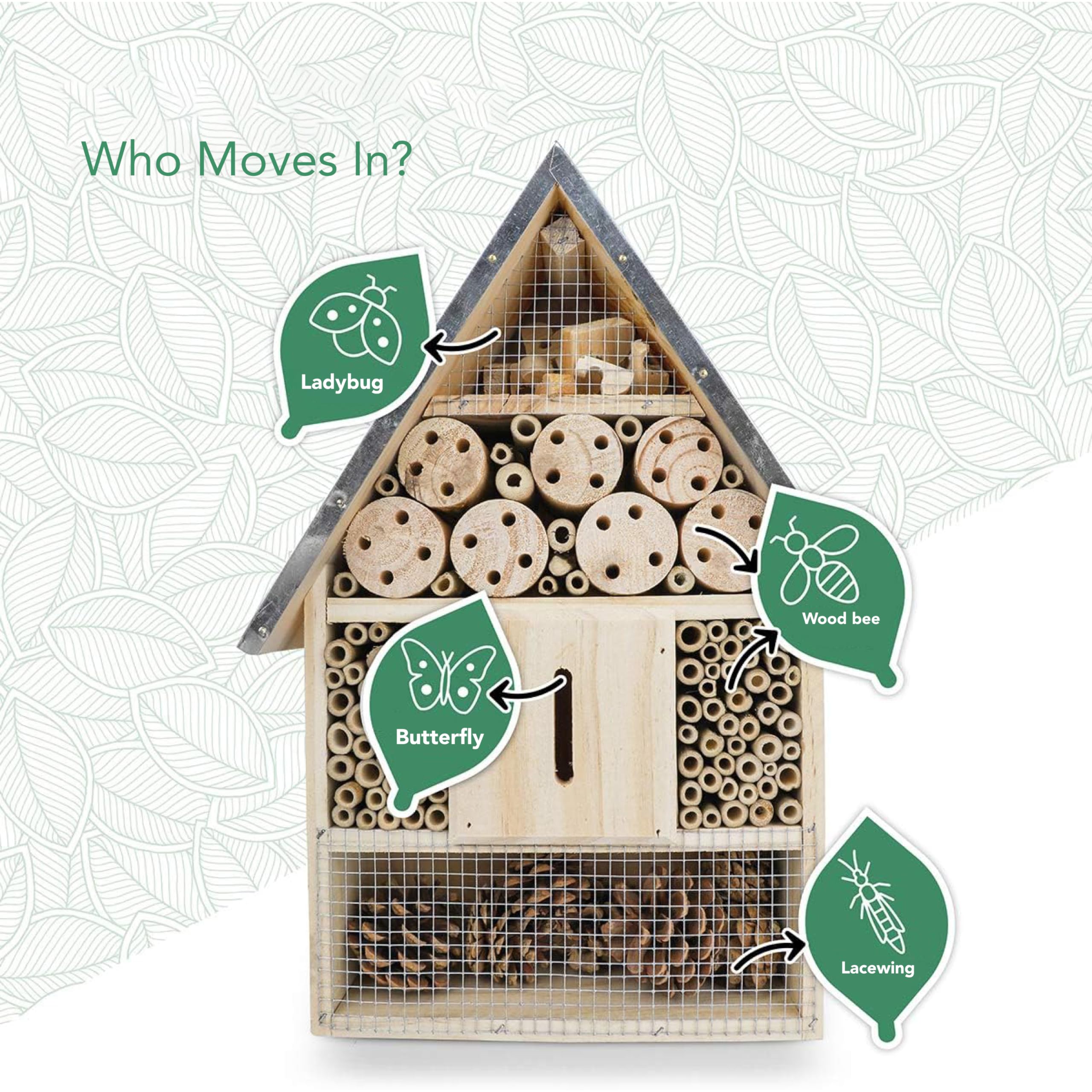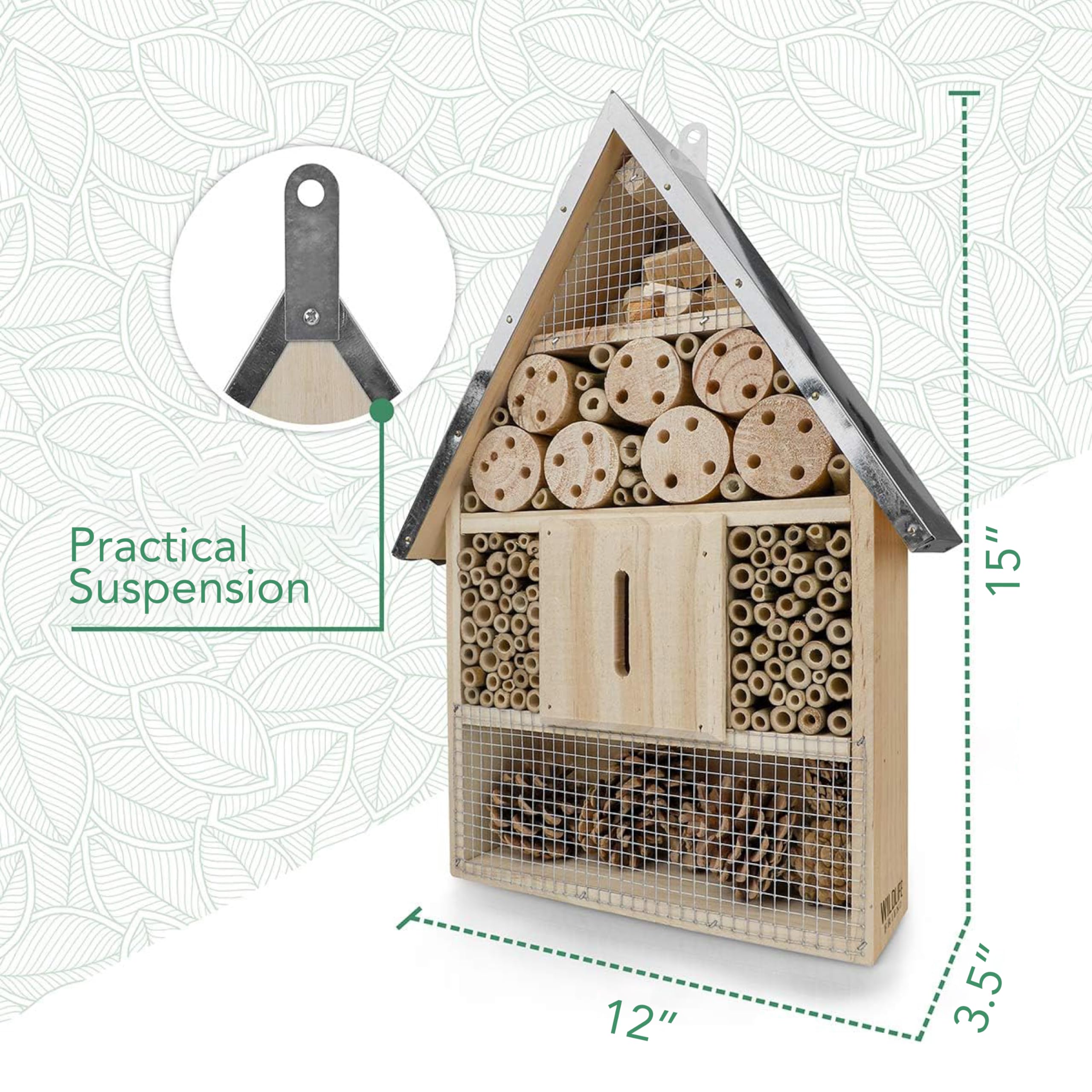 OUT OF LOVE FOR NATURE. WILDLIFE FRIEND Insect Hotel - Bee Hotel & Nesting Aid for Hanging: Enhance your garden with the Wildlife Friend Insect Hotel, a perfect nesting spot for bees, ladybugs, lacewings, butterflies, and other beneficial insects. Crafted with care, this insect hotel is made entirely of weatherproof pine wood, known for its high inherent resistance to the elements. The untreated pine wood is finely sanded and rounded at the edges, ensuring a safe and comfortable habitat for the insects. The insect hotel features various nesting chambers and a bird protection mesh, providing ample space for numerous insects to thrive. The nesting materials, including wood shavings, reed tubes, round sticks, and pine cones, are carefully selected to cater to the specific needs of different insects. Versatile in its placement, the insect house can be placed standing in your garden or on the balcony, or easily hung on a tree or wall using the included mounting strip with pre-drilled holes. The natural wood used in this insect hotel is suitable for year-round use, providing a safe haven for insects in all seasons. Supporting biodiversity in your garden, the Wildlife Friend Insect Hotel helps create a harmonious ecosystem. It is designed to attract and accommodate a variety of insects, promoting a healthy balance in your outdoor space. bee houses for pollinating bees insect hotel