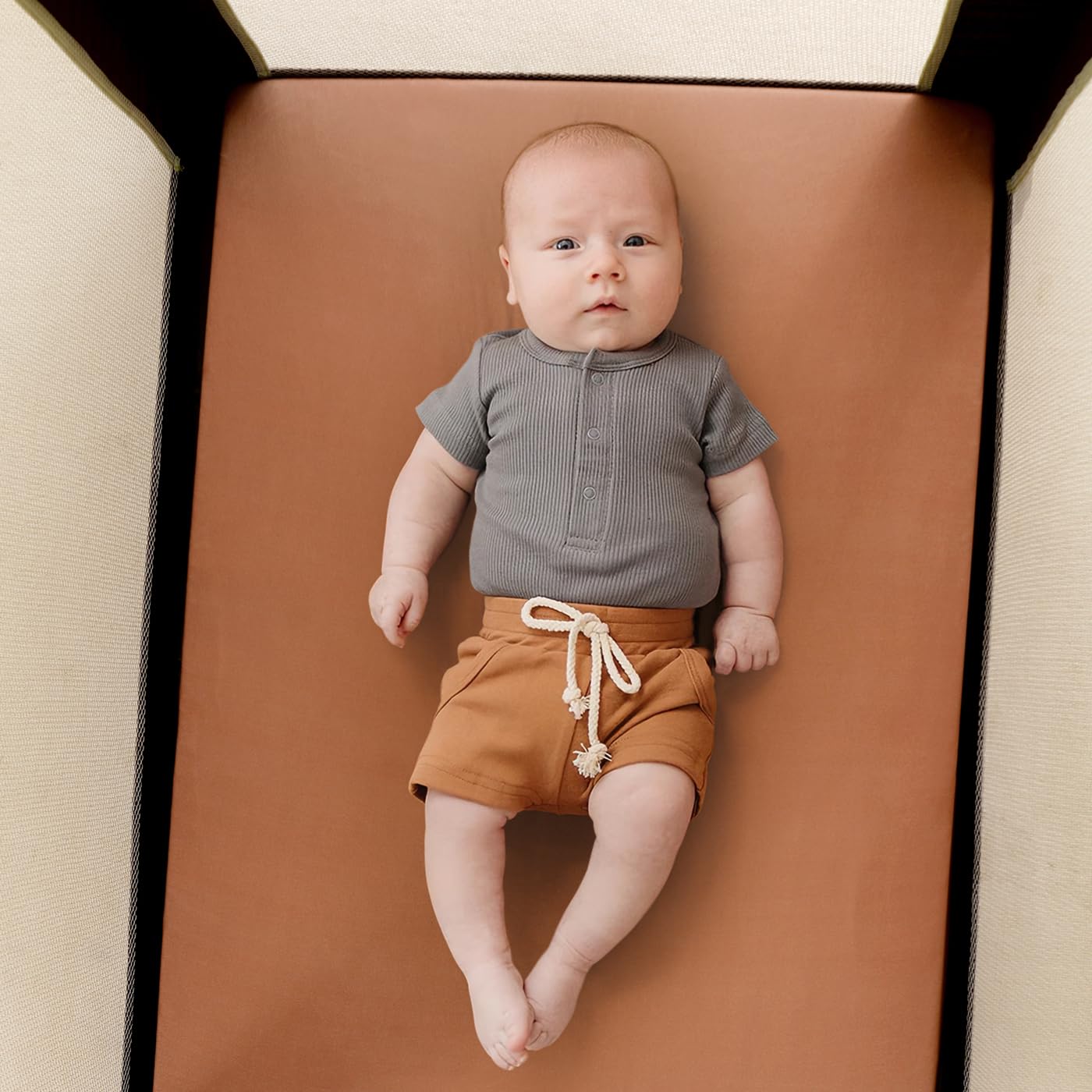 Universal Fit – Measuring 38" x 24" x 6". Our mini baby crib sheets come with an elastic band all around the sides to securely fit all standard pack n play mattresses. They are very easy to put in place even when you need to change pack n play mattresses sheets in a hurry. Perfect as a baby shower gift or for your own nursery.