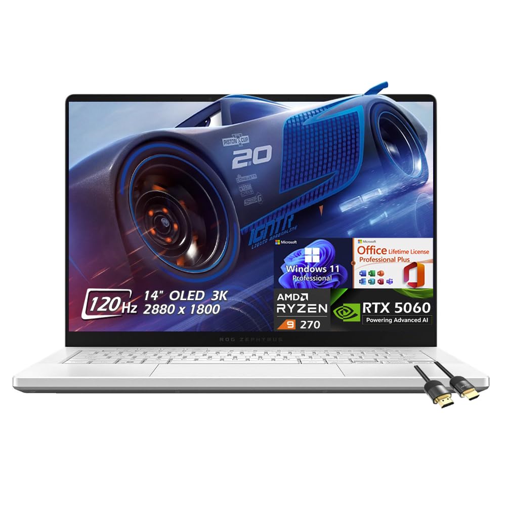 We sells computers with upgraded configurations. If the computer has modifications (listed above), then the manufacturer box is opened for it to be tested and inspected and to install the upgrades to achieve the specifications as advertised. ASUS ROG Zephyrus G14 14" OLED 3K 120Hz Gaming Laptop Operating System: Windows 11 Pro with Microsoft Office Professonial Lifetime License ; Processor: AMD Ryzen 9 270 Processor 4 GHz (up to 5.2 GHz, 8-cores); Graphics: NVIDIA GeForce RTX 5060 8GB GDDR7, DLSS 4 (Deep Learning Super Sampling), Ray tracing; RAM: 16GB LPDDR5X 7500MHz megahertz; Storage:2TB Solid State Drive (SSD) storag; Display: 14 inches 2880 x 1800 OLED 3K 120Hz G-SYNC 500 nits; Optical Drive: None / No DVD±RW Backlit Keyboard: Yes Webcam: Front Facing Camera Video Resolution 1080p, Built-In Microphone; Ports: 1 x USB-C 4, 1 x USB-C 3.2, 2 x USB-A 3.2, 1 x HDMI 2.1, Headphone Jack, Wireless Standard BE, WiFi 7, Bluetooth; Power Adapter: Power Supply Maximum Wattage 200 watts, Lithium-ion, Battery Life up to 10 hours, Battery Cells 4-cell; Dimensions (WxDxH): 0.63 inches x 12.26 inches x 8.66 inches Color: Platinum White Weight: 3.31 pounds Bundle with HDMI Cable