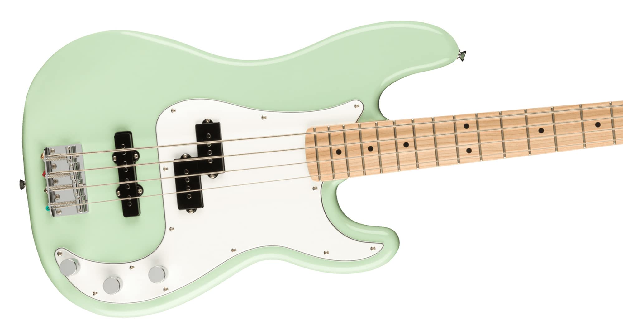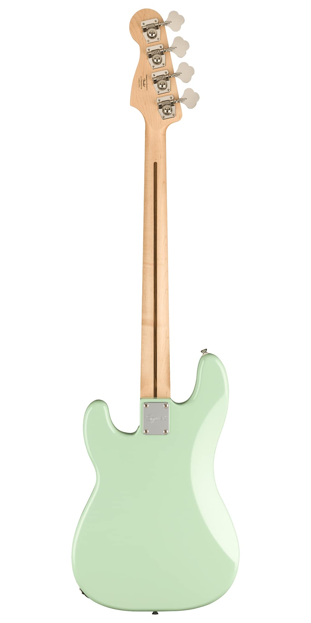 A superb gateway into the time-honored Fender family, the Squier Affinity Series Precision Bass PJ delivers legendary design and quintessential tone for today's aspiring bassist. This P Bass features several player-friendly refinements such as a thin and lightweight body, a slim and comfortable "C"-shaped neck profile and vintage-style open-gear tuning machines for smooth, accurate tuning. Loaded with a Squier split single-coil P Bass neck pickup and a single-coil J Bass bridge pickup for a wide variety of tones, this model is ready to help lay the foundation for any player at any stage. General Color: Surf Green Country Of Origin: ID Orientation: Right-Hand Series: Affinity Series Neck Fingerboard Material: Maple Fingerboard Radius: 9.5" (241 mm) Neck Construction: Bolt-On Neck Finish: Satin Urethane with Gloss Urethane Headstock Face Neck Material: Maple Neck Shape: "C" Shape Number of Frets: 20 Nut Material: Synthetic Bone Nut Width: 1.625" (41.3 mm) Position Inlays: Black Dot Side Dots: Black String Nut: Synthetic Bone Truss Rod: Head Adjust Body Body: Poplar Body Finish: Gloss Polyurethane Body Material: Poplar Body Shape: Precision Bass Hardware Bridge: 4-Saddle Standard Control Knobs: Knurled Flat-Top Hardware Finish: Chrome Neck Plate: 4-Bolt Squier Pickguard: 3-Ply Black Pickup Covers: White