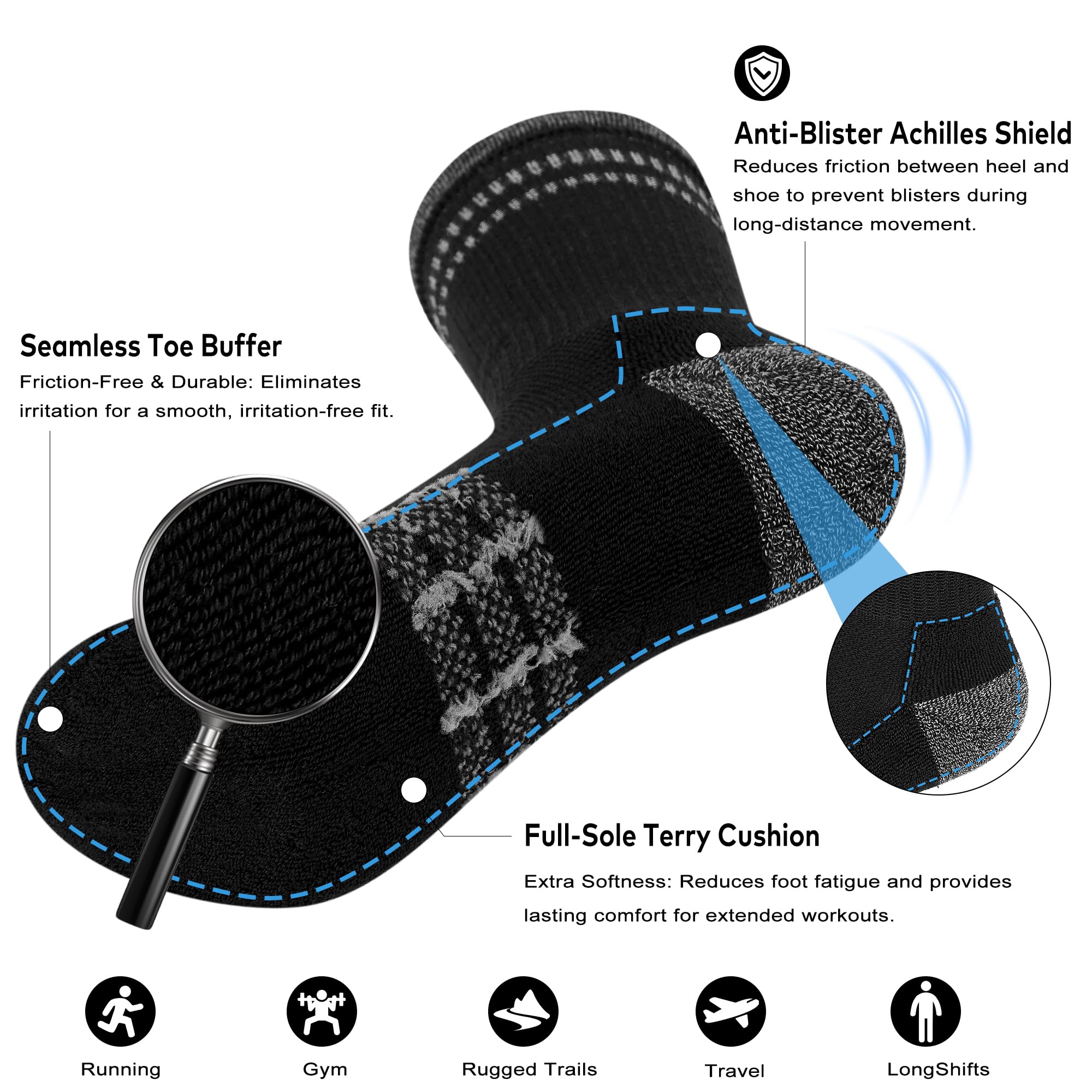 Impact-Absorbing Full Sole Cushioning: Features high-density thickened padding across the heel, toe, and sole areas. These athletic socks are capable of absorbing repetitive shocks and reducing foot fatigue, allowing you to maintain peak performance during high-impact running or gym sessions